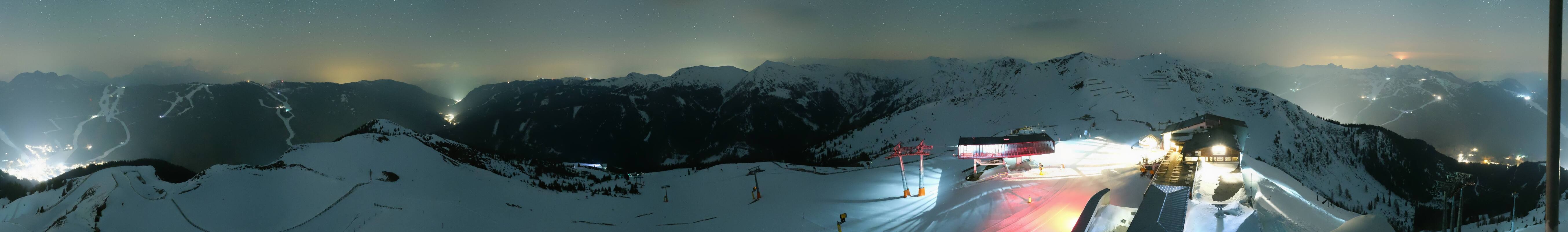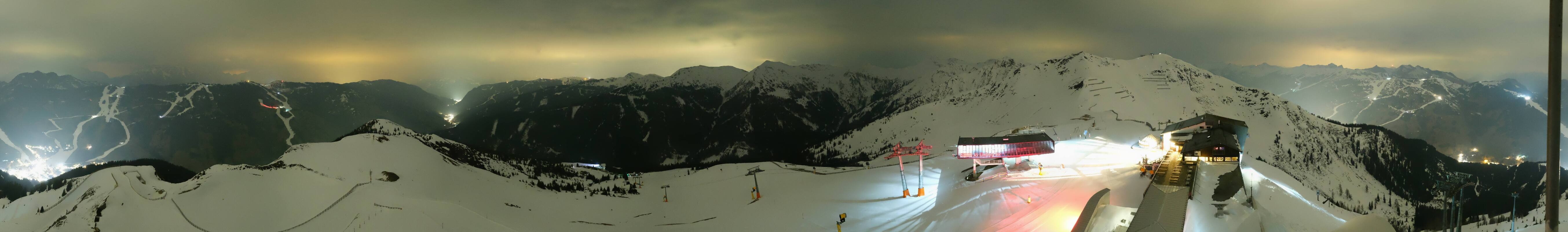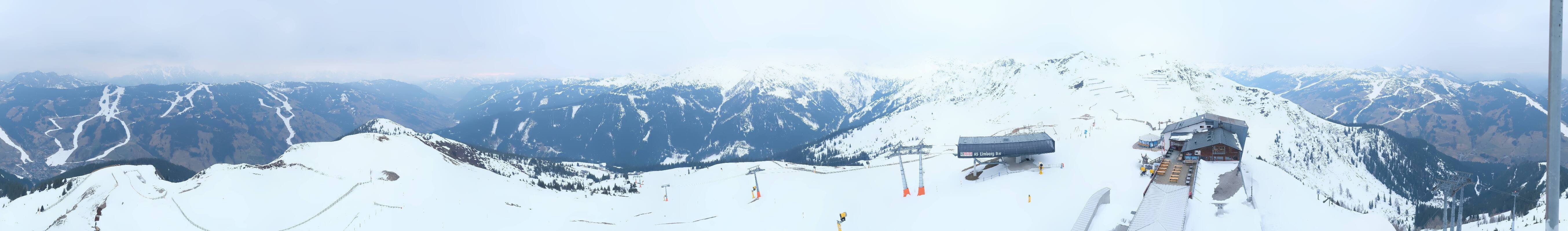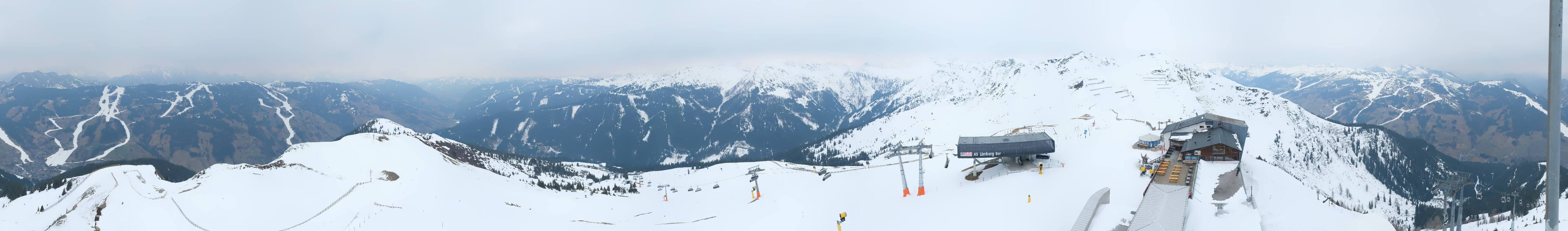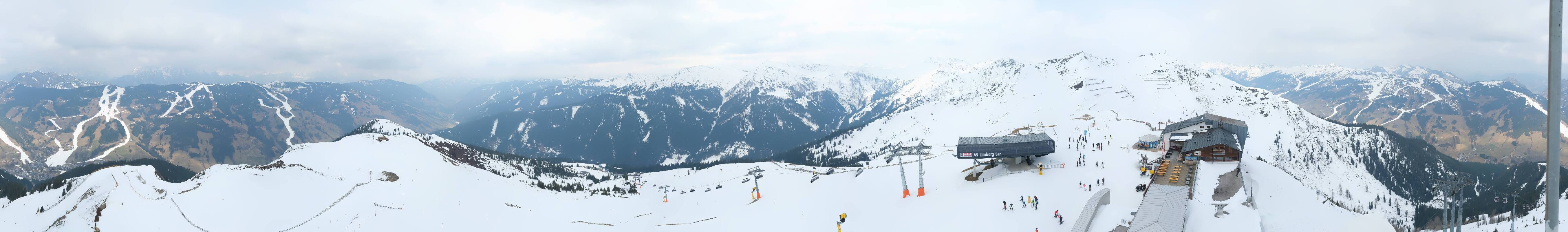 Enjoy the view at the top station of the Schattberg X-press II (2.010m) in the ski area Saalbach Hinterglemm Leogang Fieberbrunn towards Limberg run, Sky Rest and Saalbach.