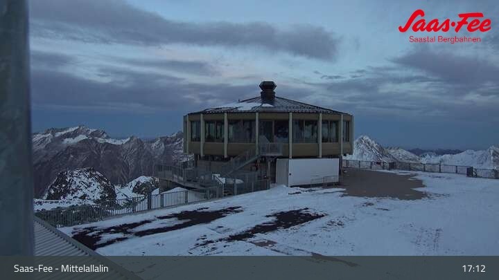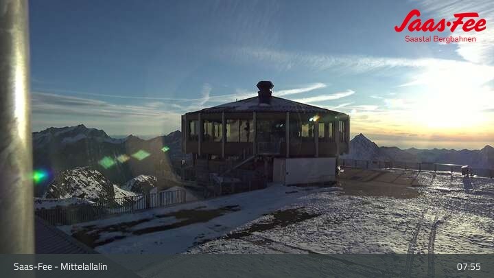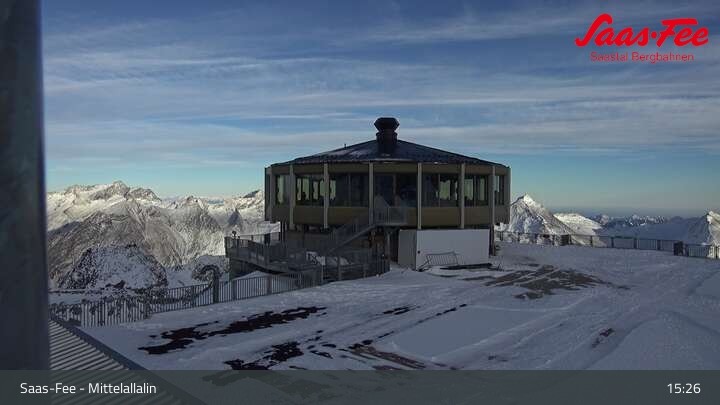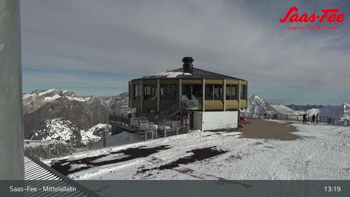 This webcam is located on Mittelallalin, a minor summit below Allalinhorn in Saas-Fee. You can see the local restaurant that boasts a great panoramic view of the surrounding Alps.