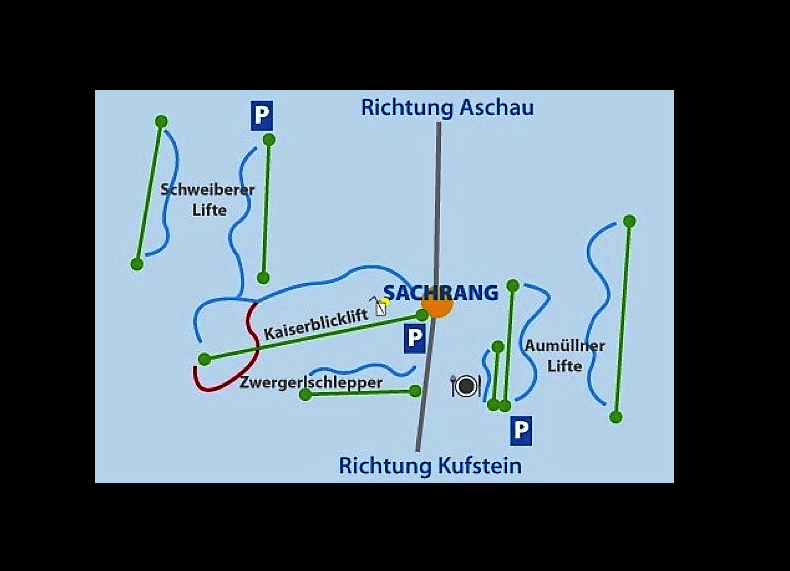 Coming from Kufstein you reach the skiing area Sachrang via the B 175. Via Oberndorf and Ebbs you reach Germany. Shortly after the border crossing turn left into the village street of Sachrang and follow the signs to the ski lifts.