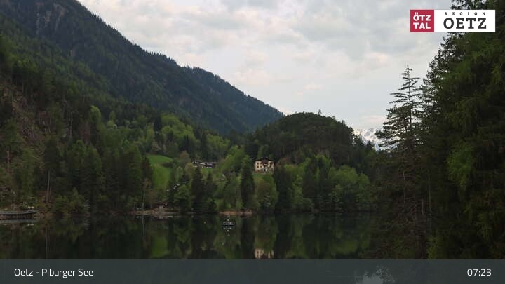 Archived webcam image showing Oetztal: View Lake Piburg on 28 Apr 2026 at 07:36 06:00