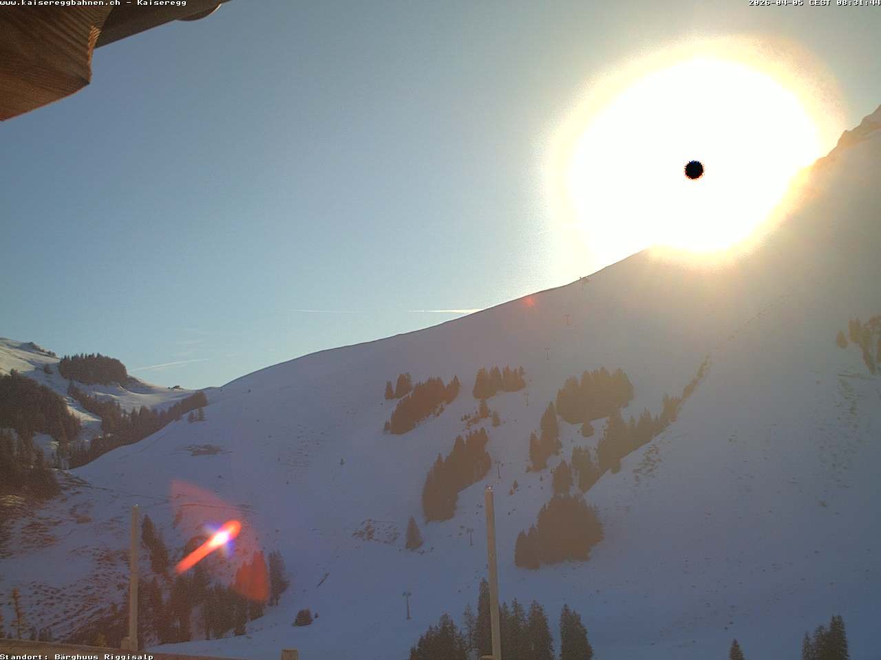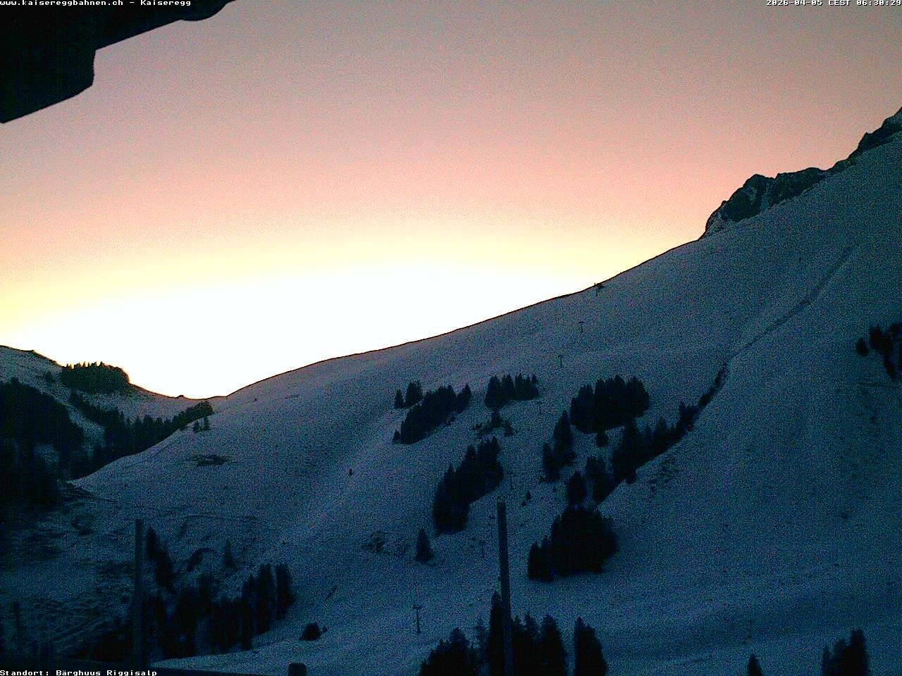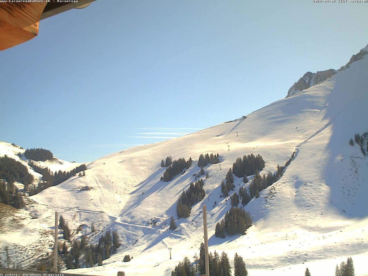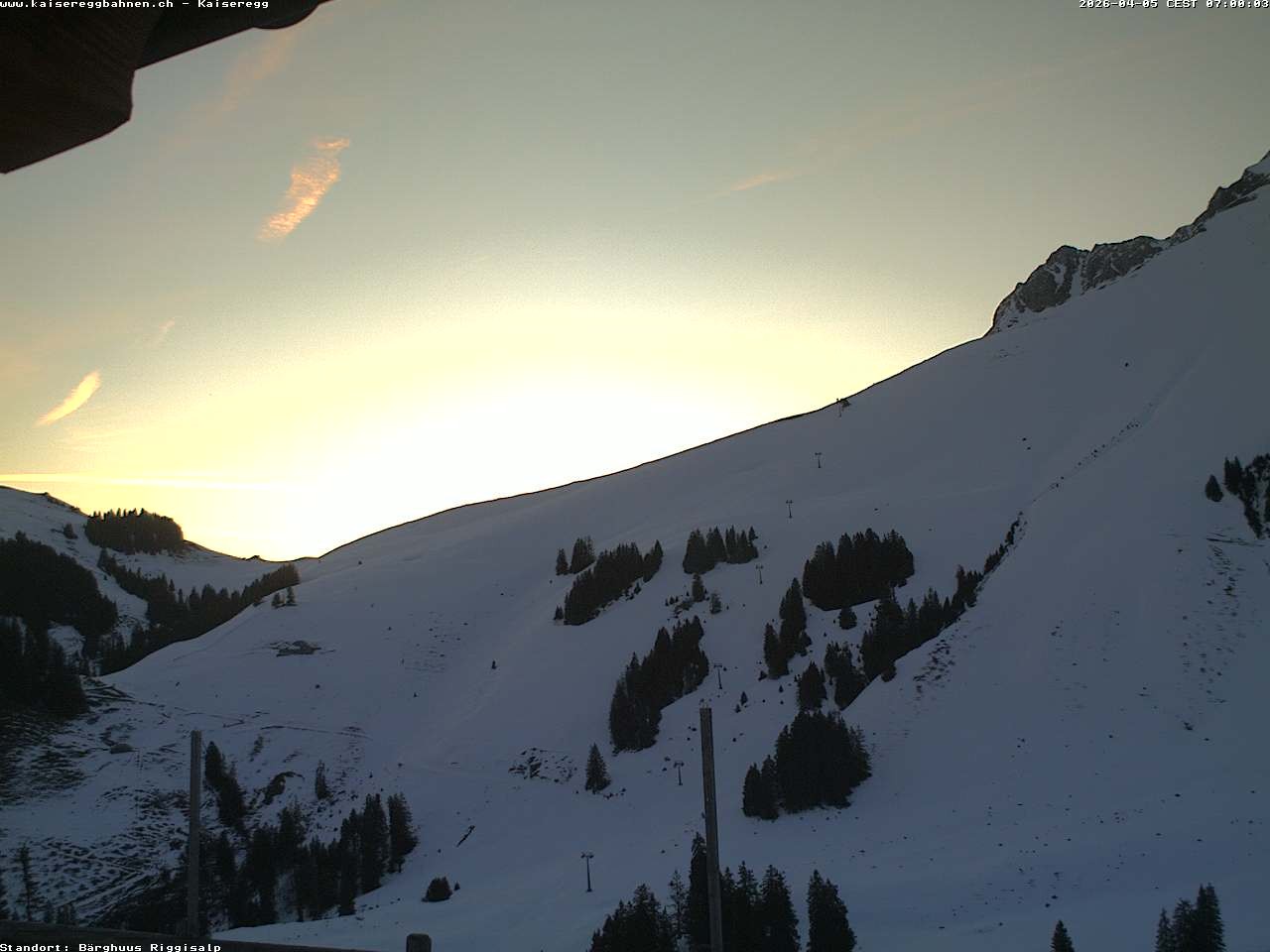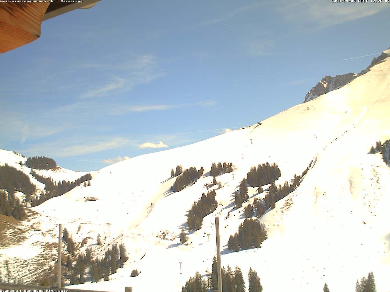 From the mountain hut Bärghuu Riggisalp, this webcam offers the view towards chairlift Kaiseregg. It is located in ski resort Schwarzsee Riggisalp Kaiseregg.