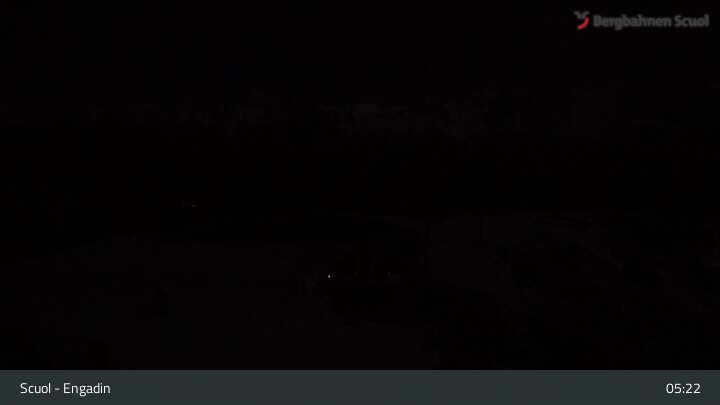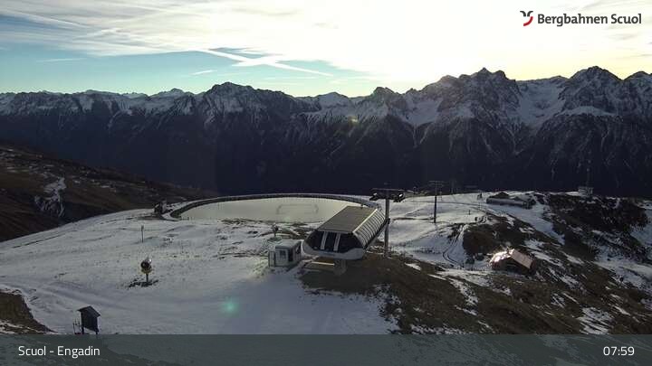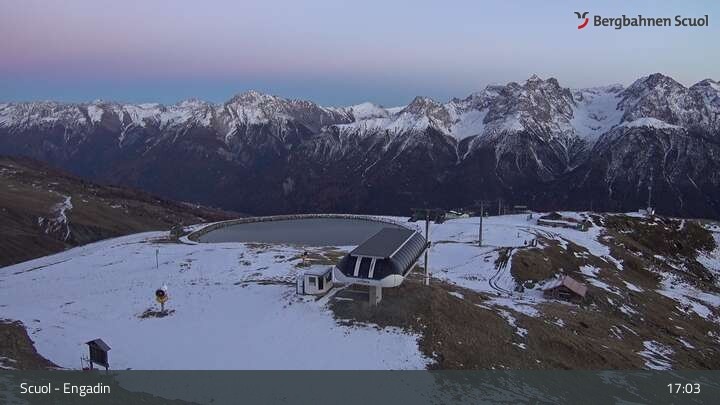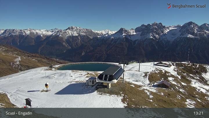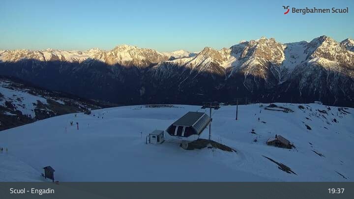 View from mountain "Schlivera" towards the top station of the chair lift Naluns in the ski area Scuol.