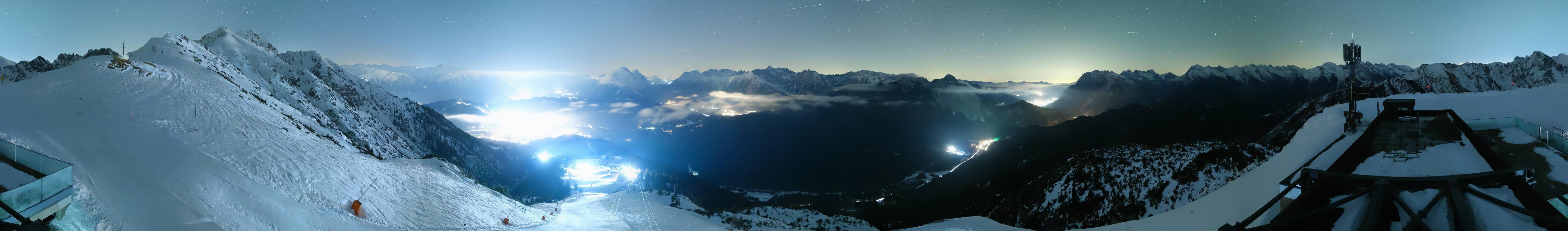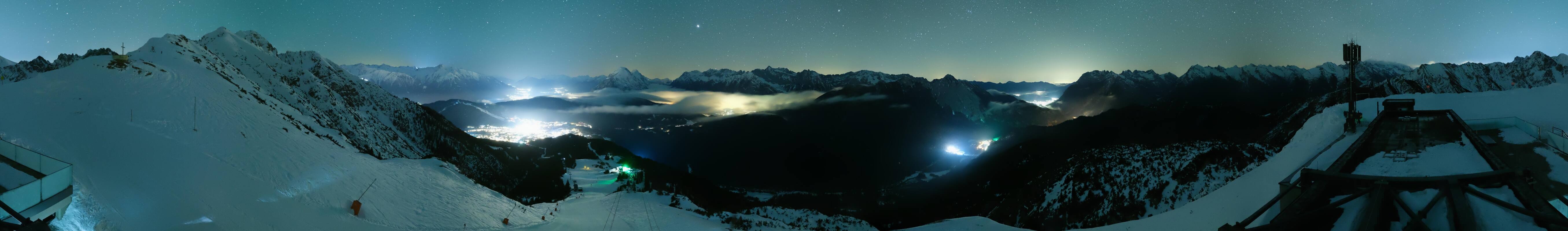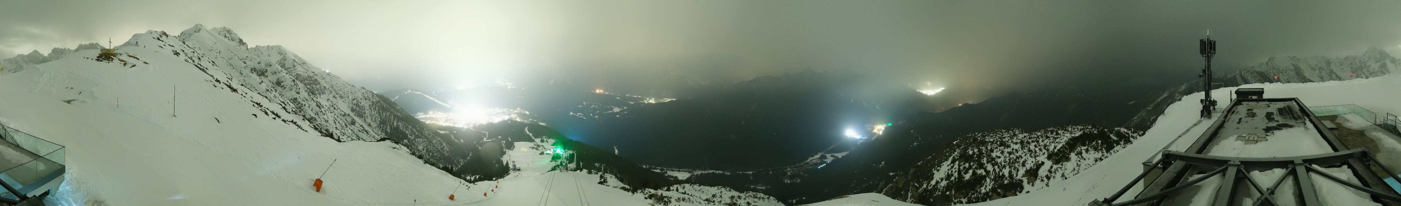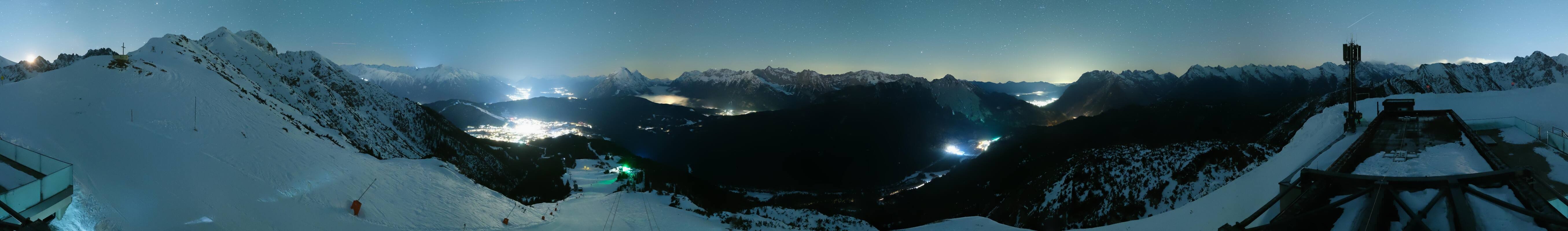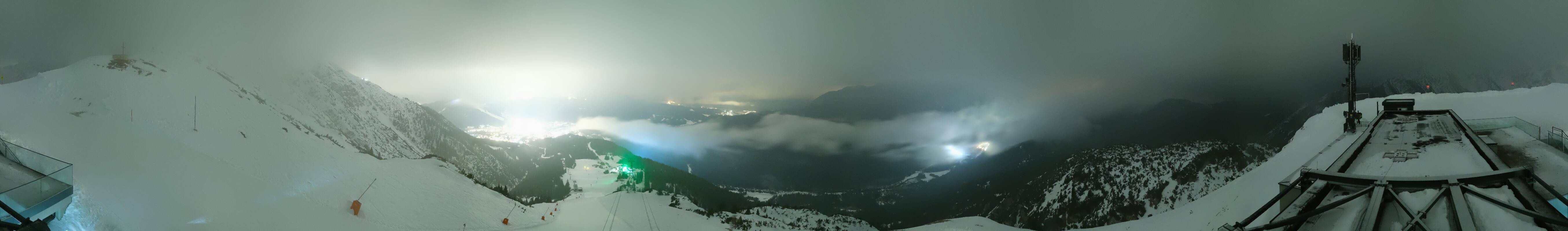 Enjoy the panoramic view from the top station at Seefelder Joch in the Rosshütte ski area down into the valley to Seefeld in Tyrol. In addition to the Seefelder Jochbahn, you can also see the Jochlift and the Rosshütten-Express chairlift.