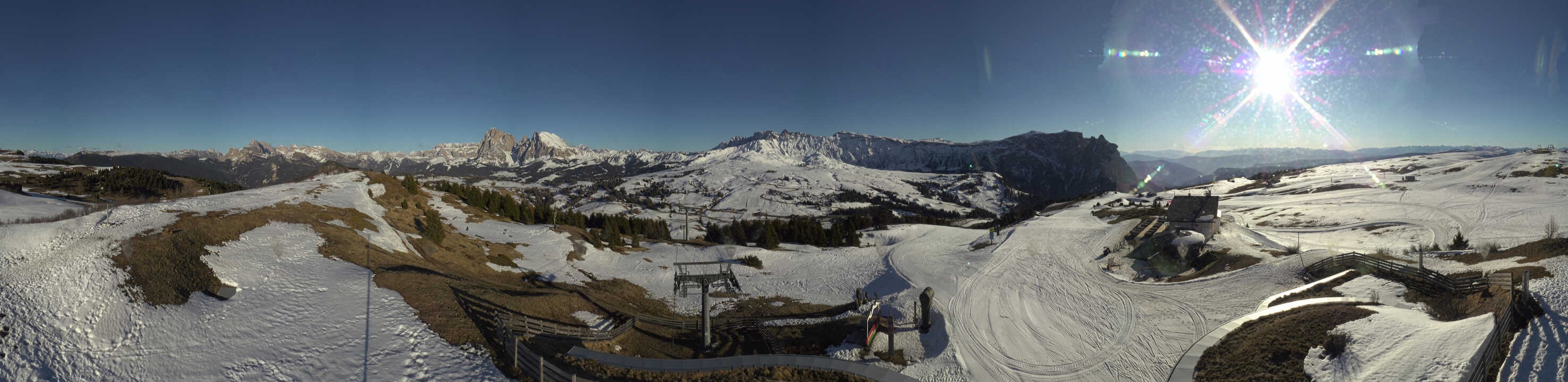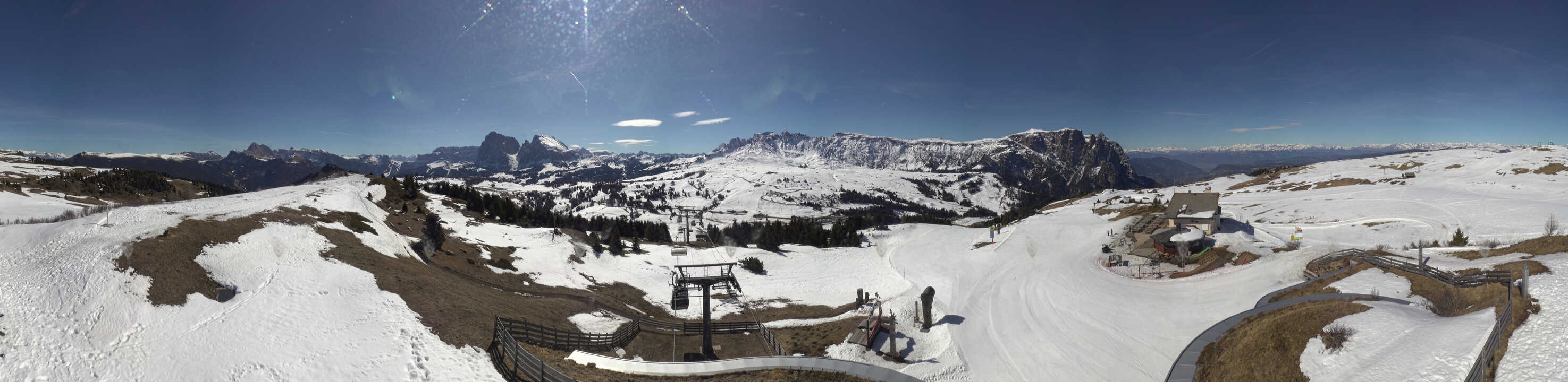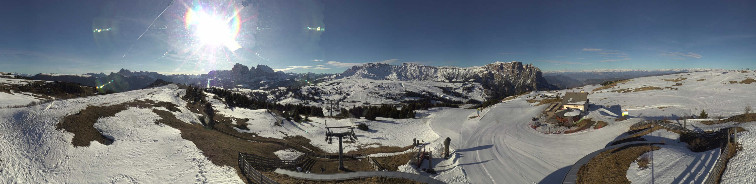 Here you can see the panorama of the Alpe di Siusi with the Sella Group, the Puez-Odle Group and the Gardena. On the right side of the picture is also the mountain restaurant Puflatsch, on the left you can see the cable car.
