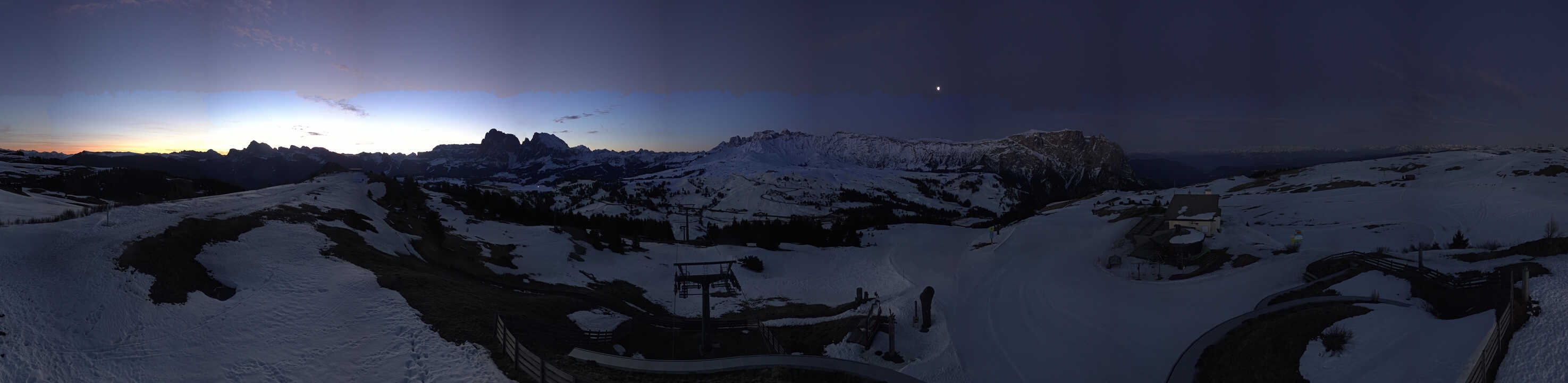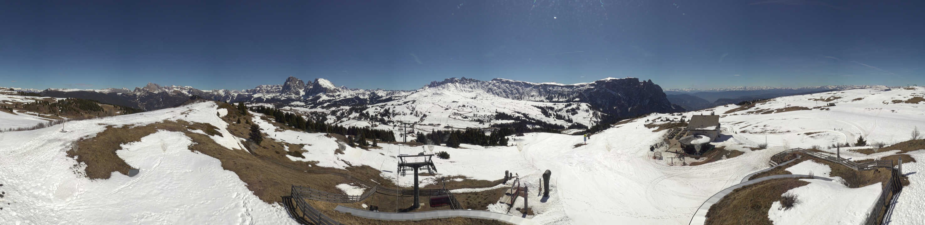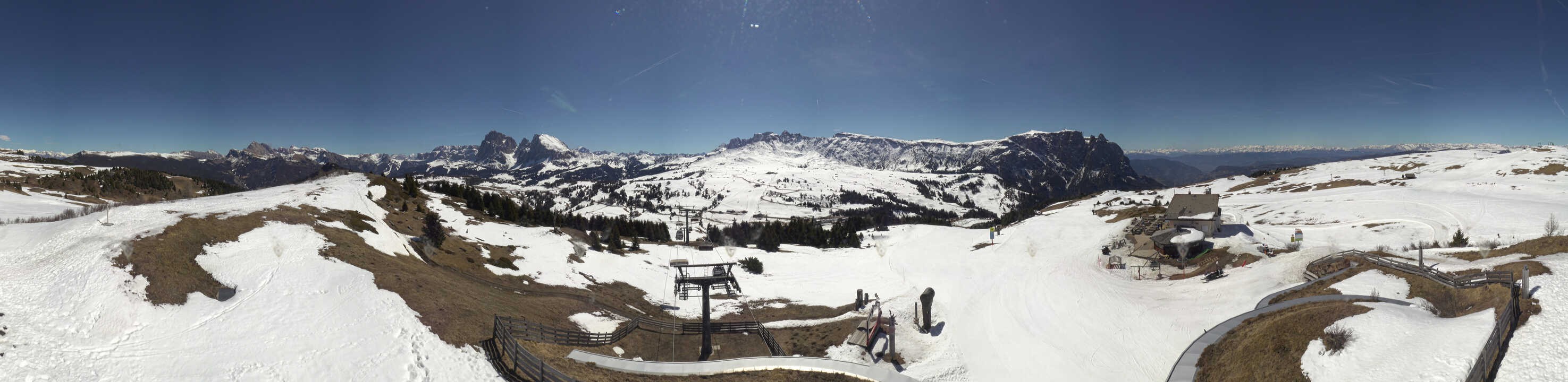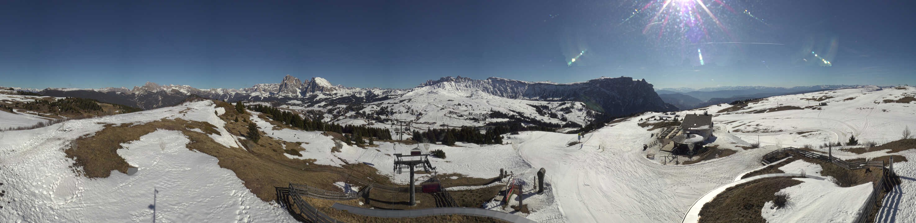 Here you can see the panorama of the Alpe di Siusi with the Sella Group, the Puez-Odle Group and the Gardena. On the right side of the picture is also the mountain restaurant Puflatsch, on the left you can see the cable car.