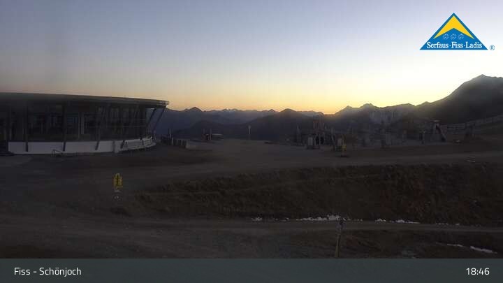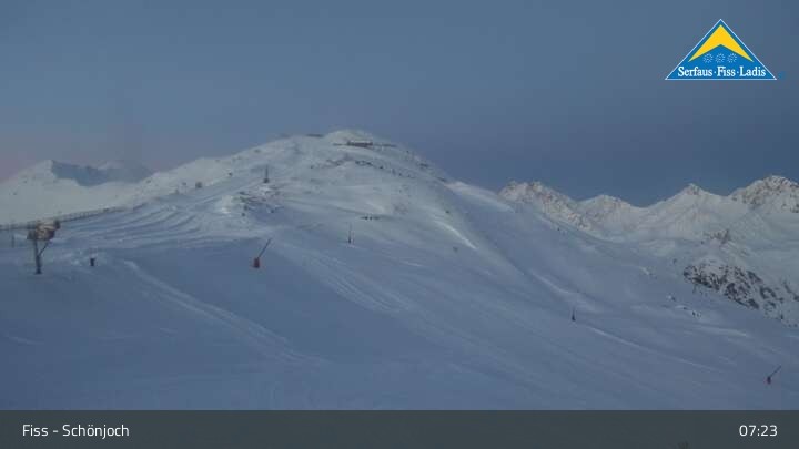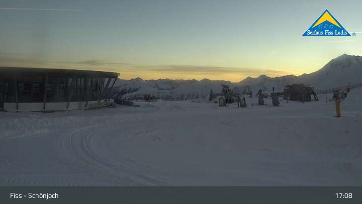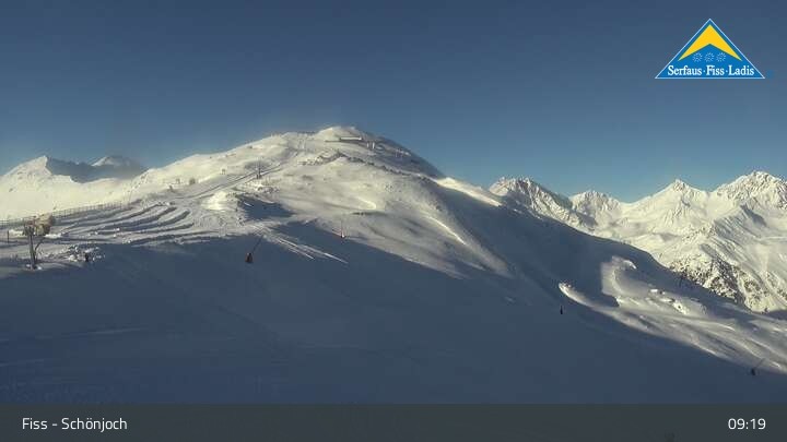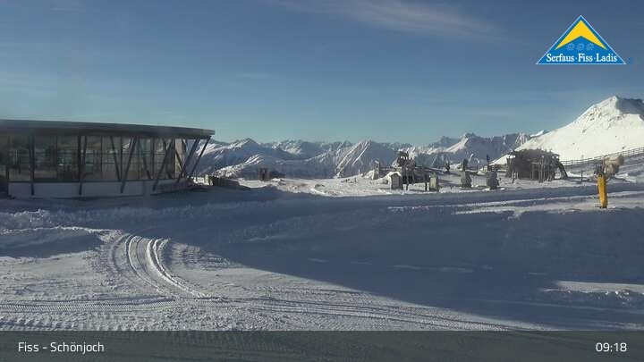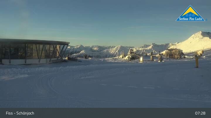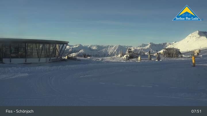 Panoramic view of Schönjochbahn ski lift over the surrounding mountain landscape at the ski region Serafaus Fiss Ladis.