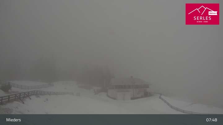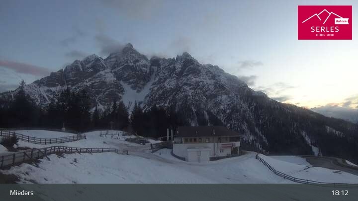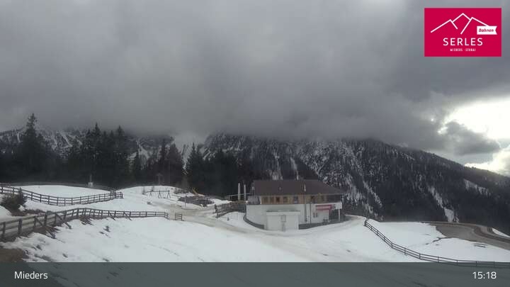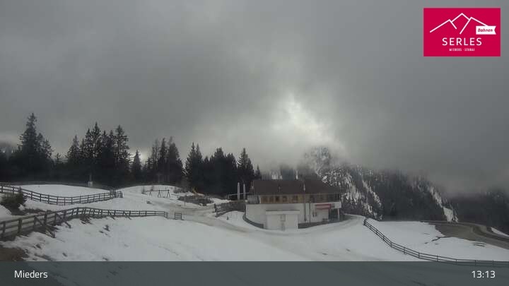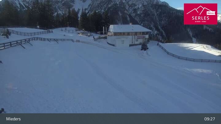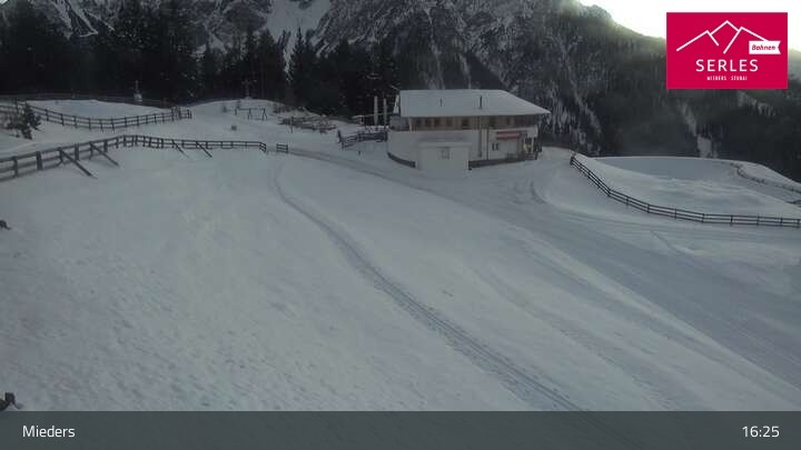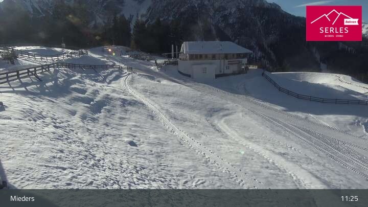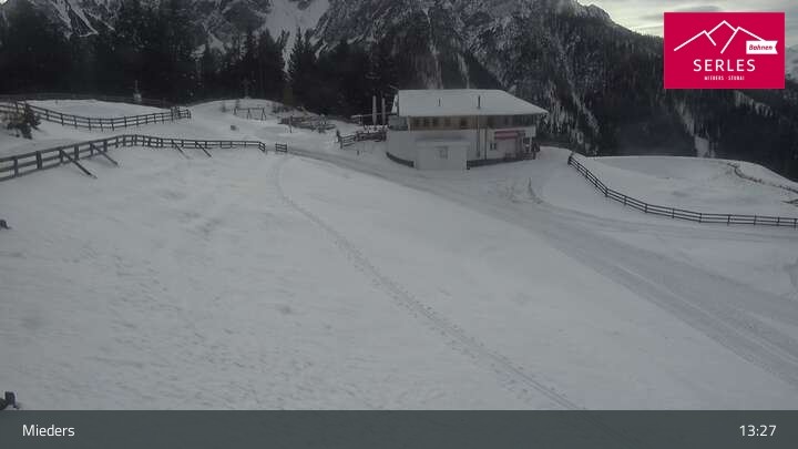 A glorious view towards the mountain Serles, as well as the toboggan run and the Waldrasteck slope in the Tyrolean ski resort of Mieders. One can also spot the mountain station of the cable car „Serlesbahn“ at the 1,600 meter high Koppeneck, the Koppeneck ski hut with playground and the reservoir.