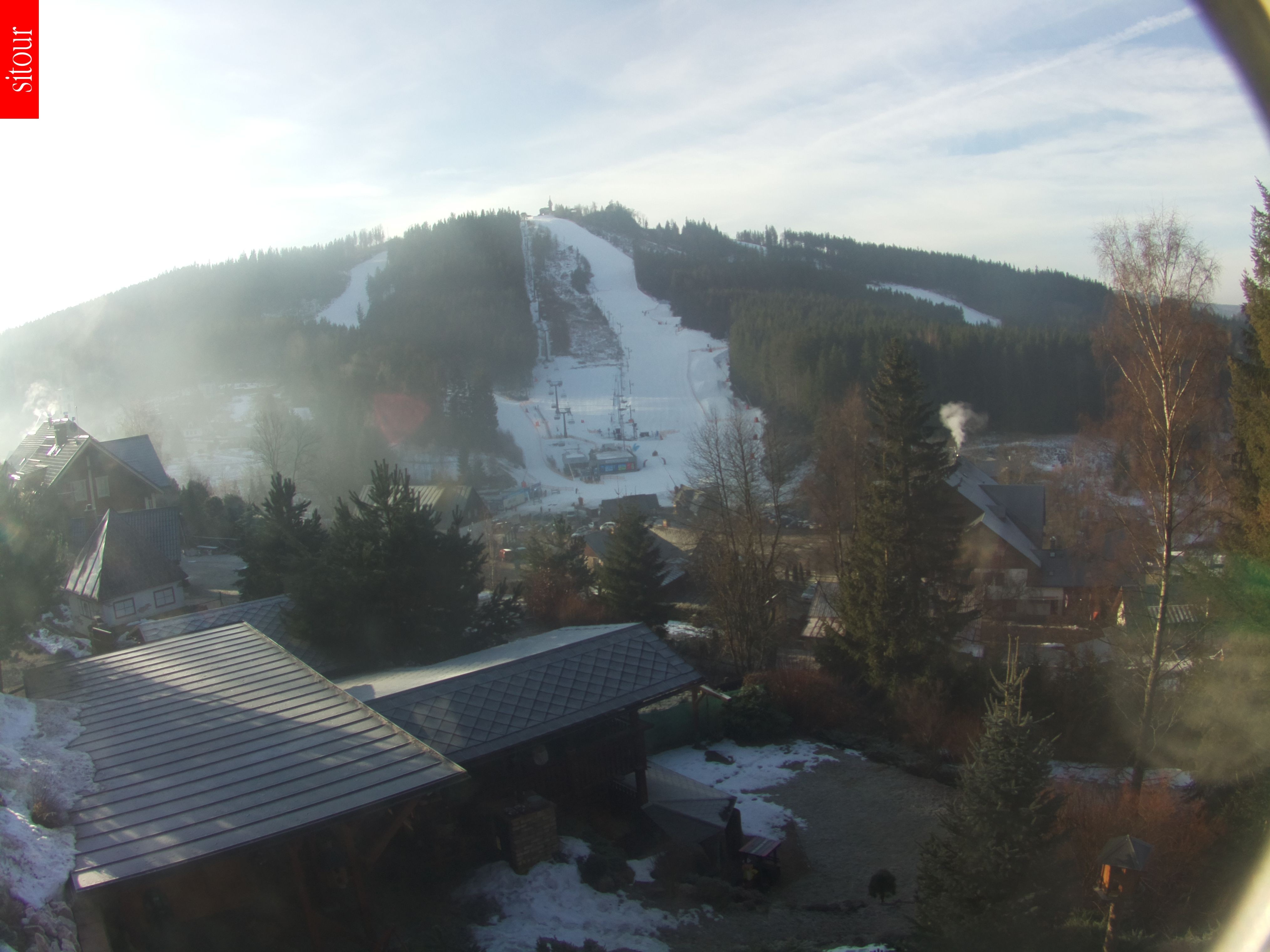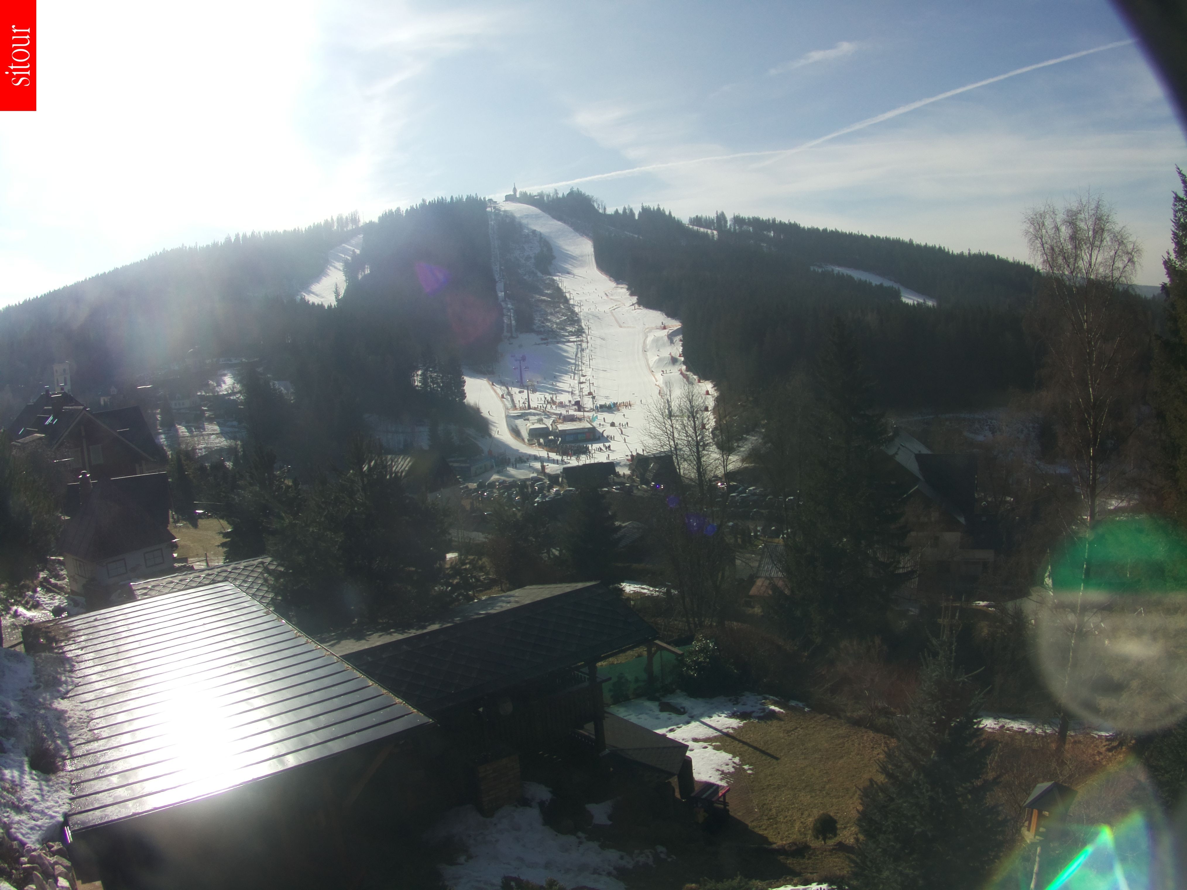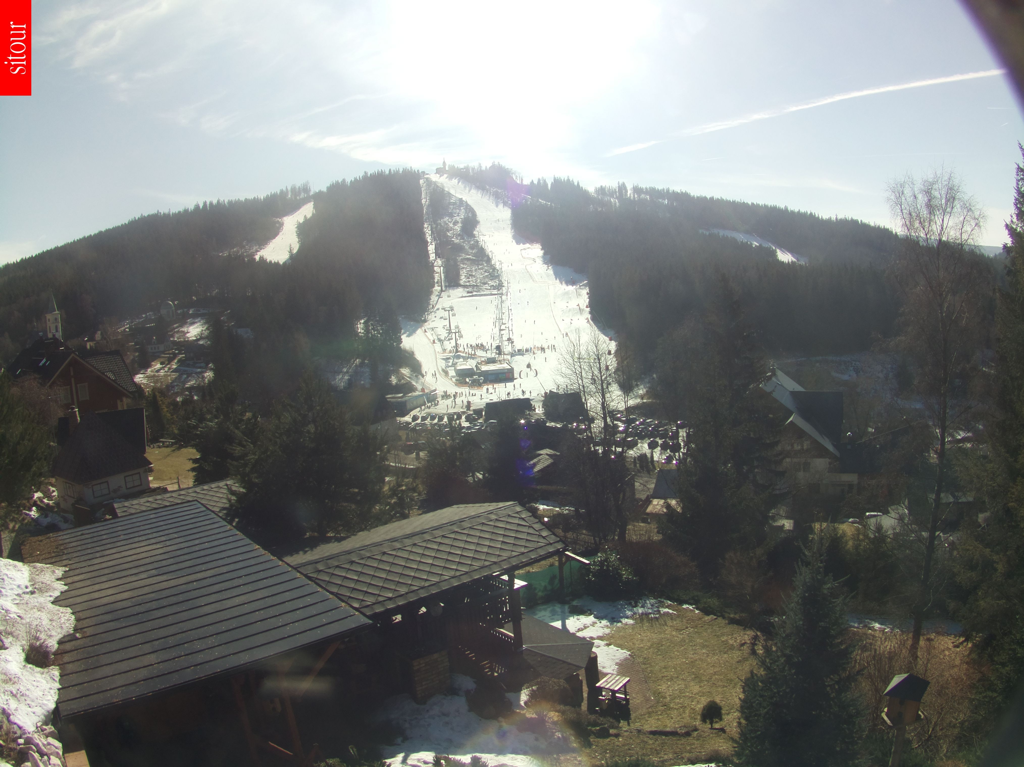 The webcam shows the ski school park in the ski area Severák in the north of the Czech Republic.