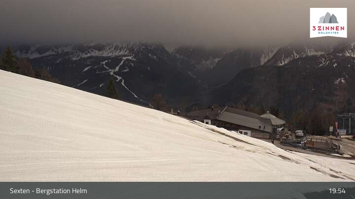 Archived webcam image showing Sextner Dolomites Skiing Mountain Helm on 20 Apr 2026 at 19:06 Latest