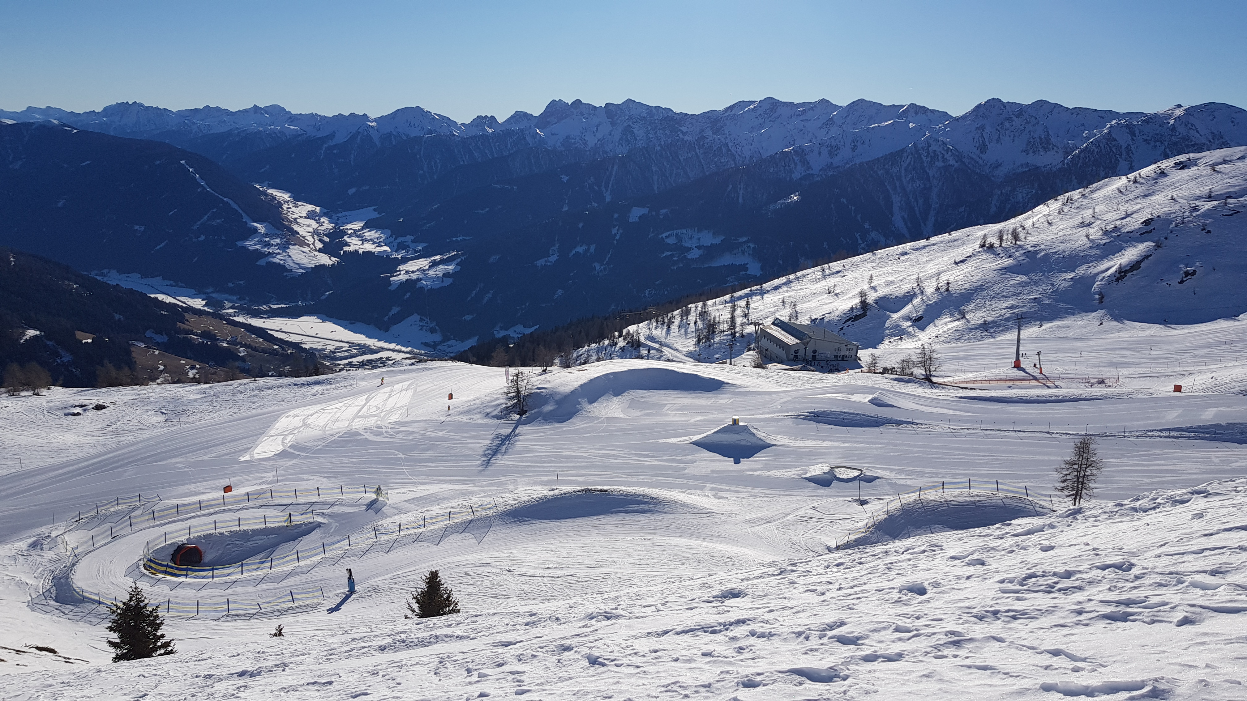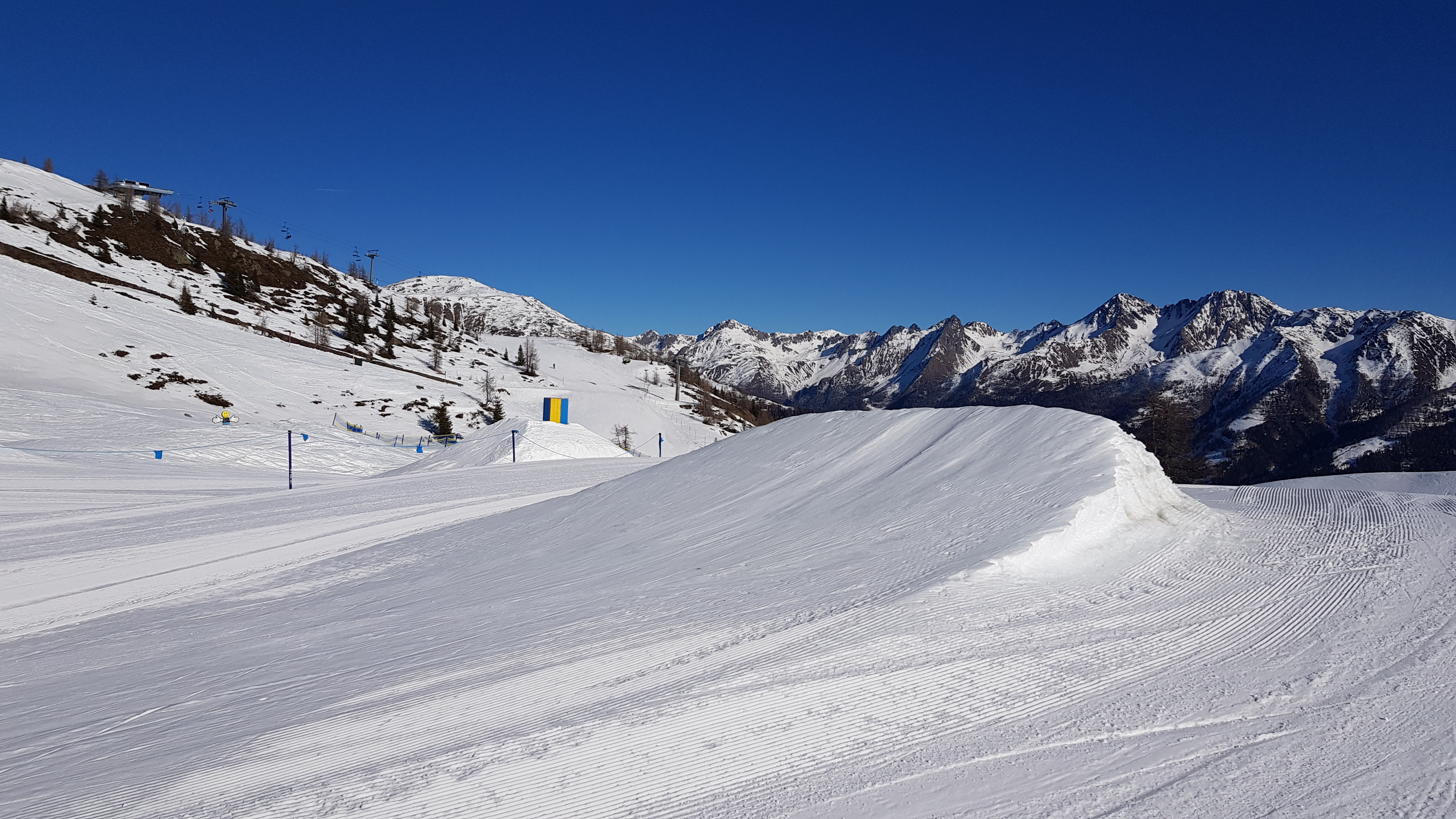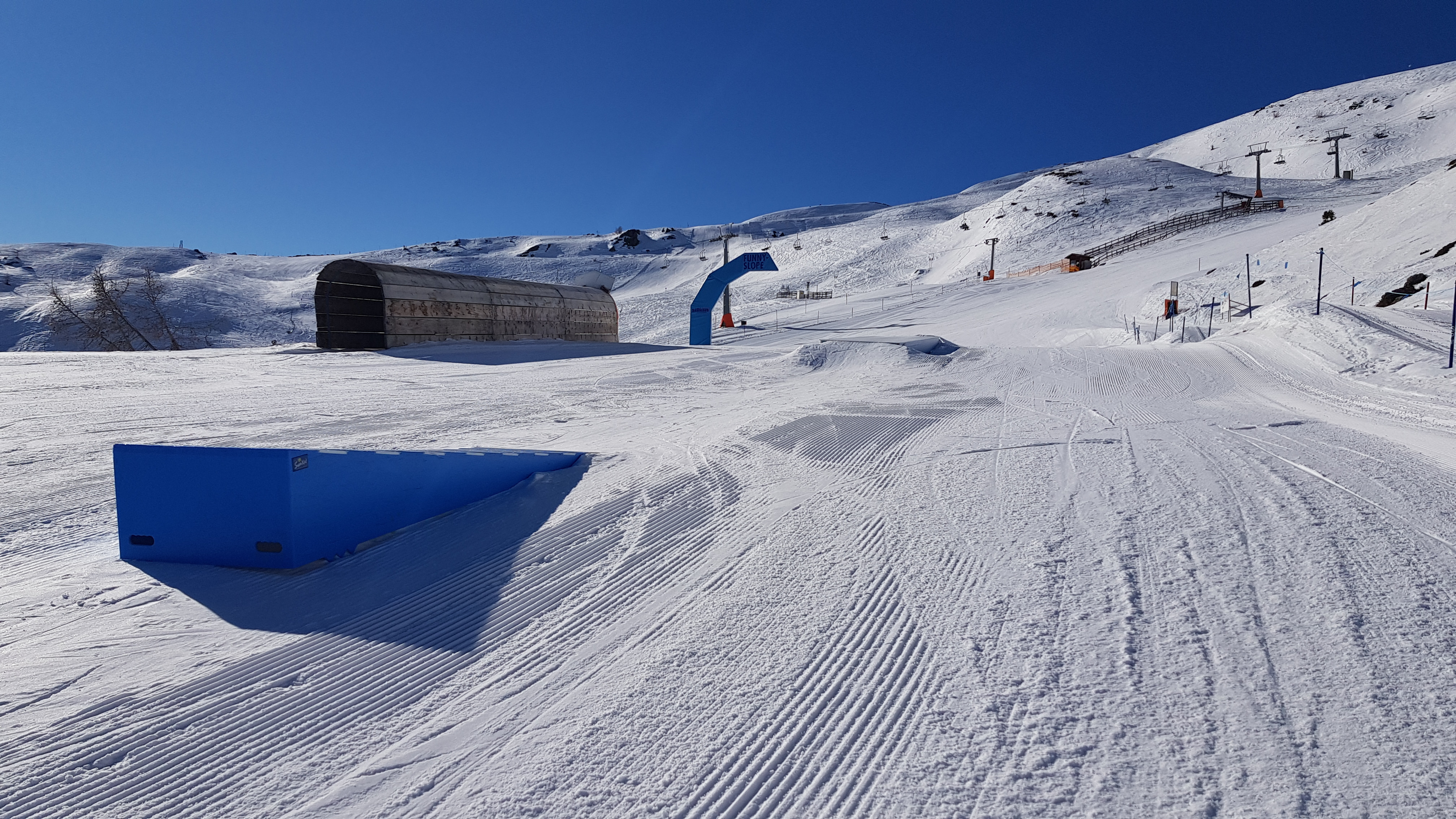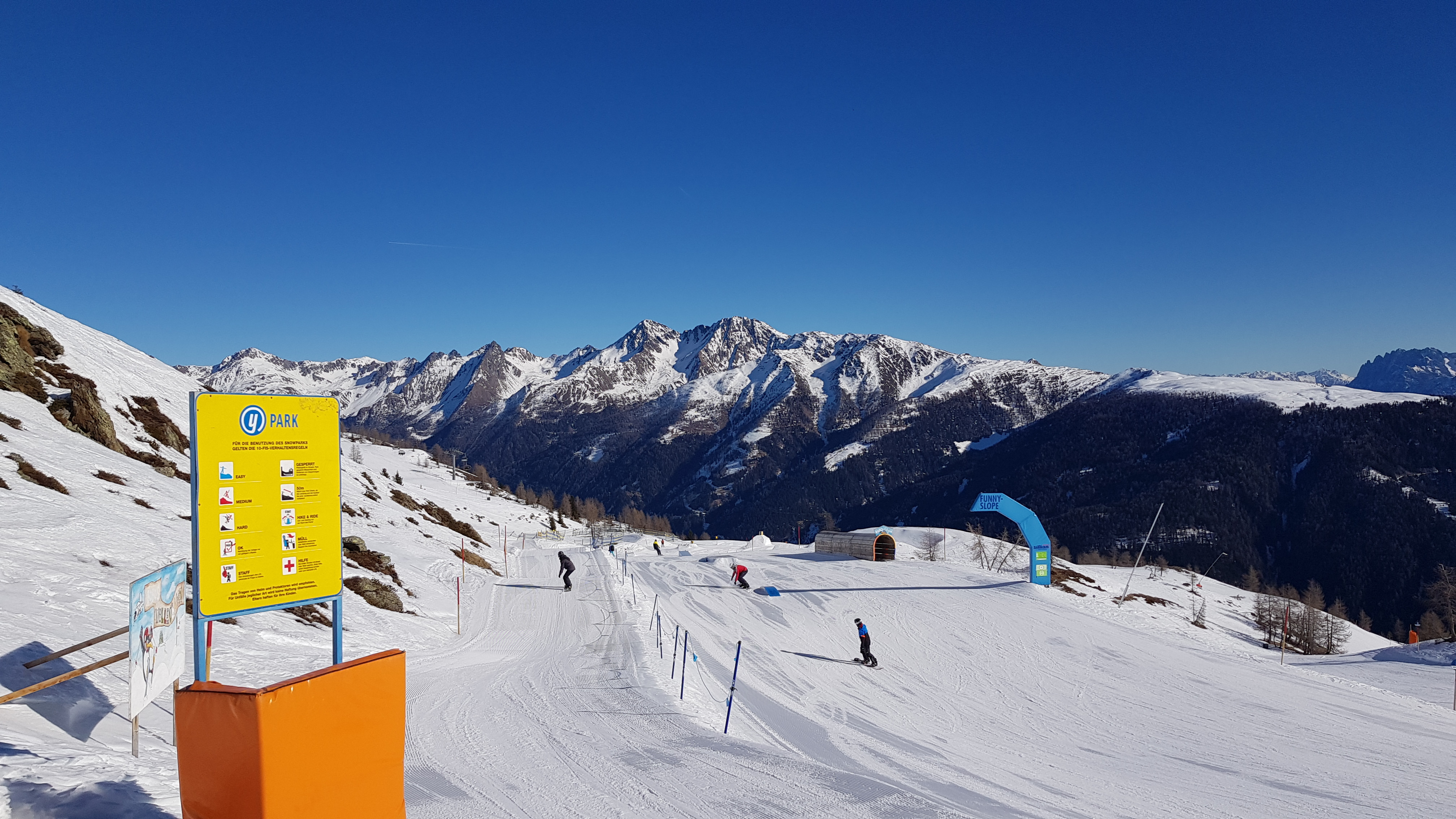 The setting is changed annually and includes obstacles for different skill levels. The offer ranges from fun elements for kids (wave run, snail, tunnel) to smaller boxes and rails to kickers. Freestyle pros will surely miss the really big kickers or halfpipes here, but for a ski resort of this size the set-up is actually surprisingly versatile.