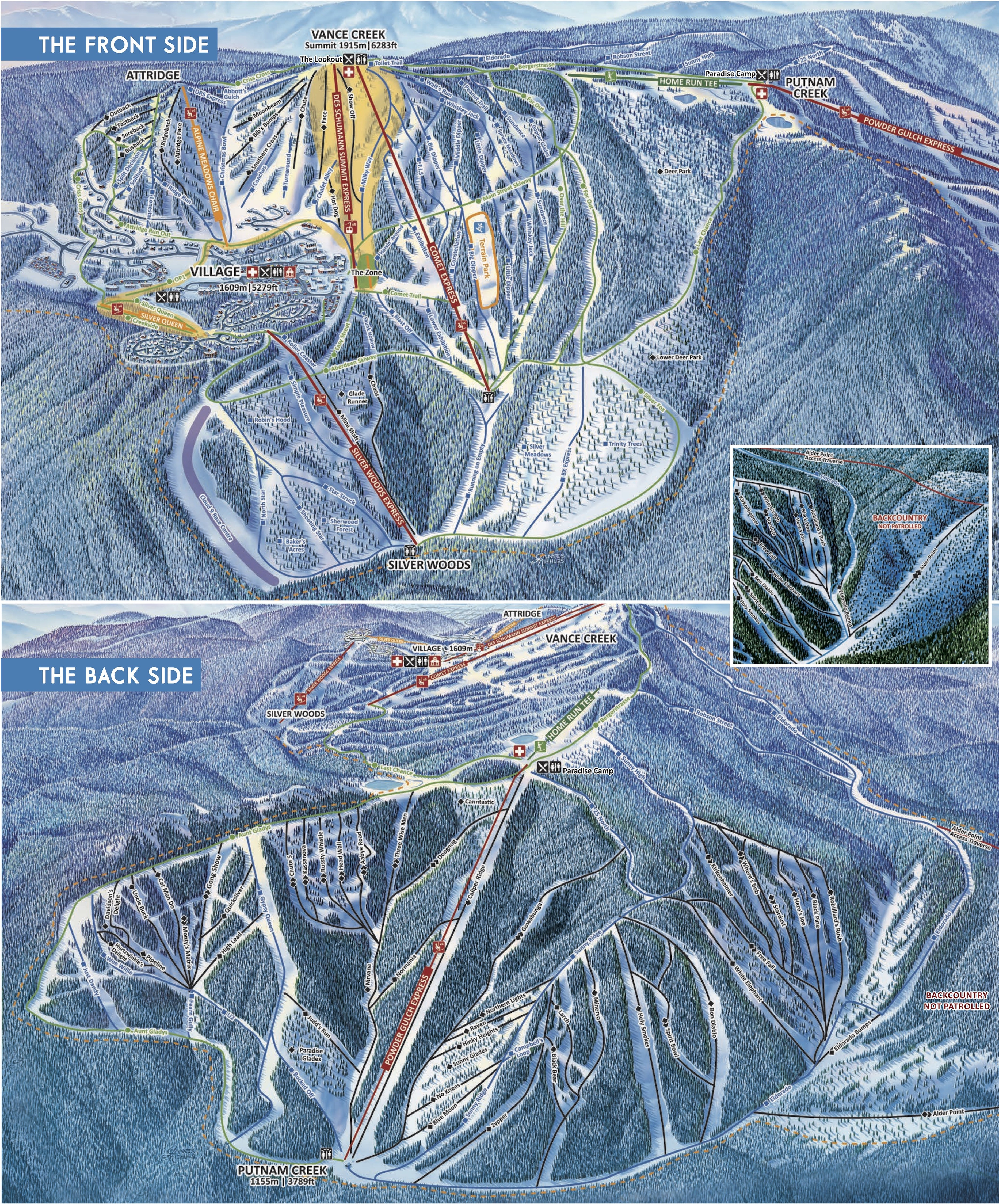 The top of the Comet chair as well as the Alpine Meadows lift link to the Attridge area, which has both easy runs, such as Criss Cross and Ridge Run, and steep blacks like Outback, Fastback, Soreback, and Busback. Ride Summit Chair or Comet Express up to Vance Creek to access great intermediate terrain, for instance Walt’s Run and Milky Way, but also some black diamond slopes, such as Face and Show Off. From there you can ski down to the Silver Woods Express, which mainly serves intermediate slopes and glades. All runs offer a fantastic view of British Columbia's Okanagan Valley and many a time the chance to switch onto another run, which does not only make the ski resort way more interesting and huge in its varieties, but it is also great fun on the slopes itself, especially after a few days spent in the resort. Perfect for all novices and beginners are the numerous long, green runs, like Main Street Skiway or Last Chance.