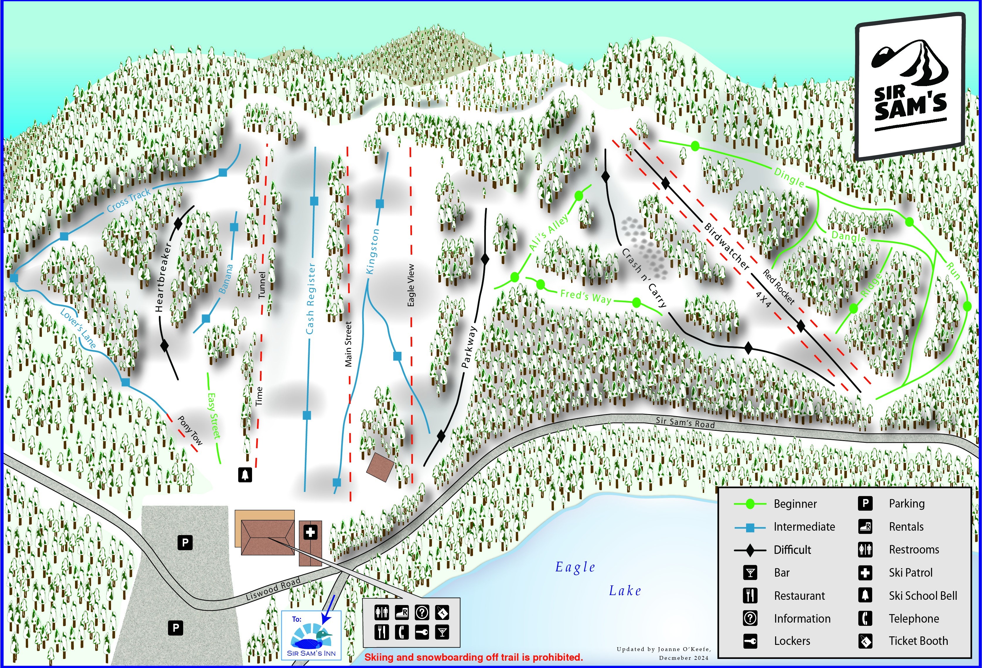Sir Sam's Ski/Ride has been a must visit ski hill for families since 1965. Four chairlifts and one surface lift ensure you can ski as many runs in a day without waiting in long lift lines. The terrain park down Lover's Lane will satisfy snowboarders and skiers alike and the winding Dingle Dangle trail lined with trees makes for a very idyllic experience. The onsite Snow School offers single or group lessons for skiers and snowboarders of all ability levels while the onsite Rental Shop will be able to provide you with any equipment you need to have a wonderful day on the slopes.