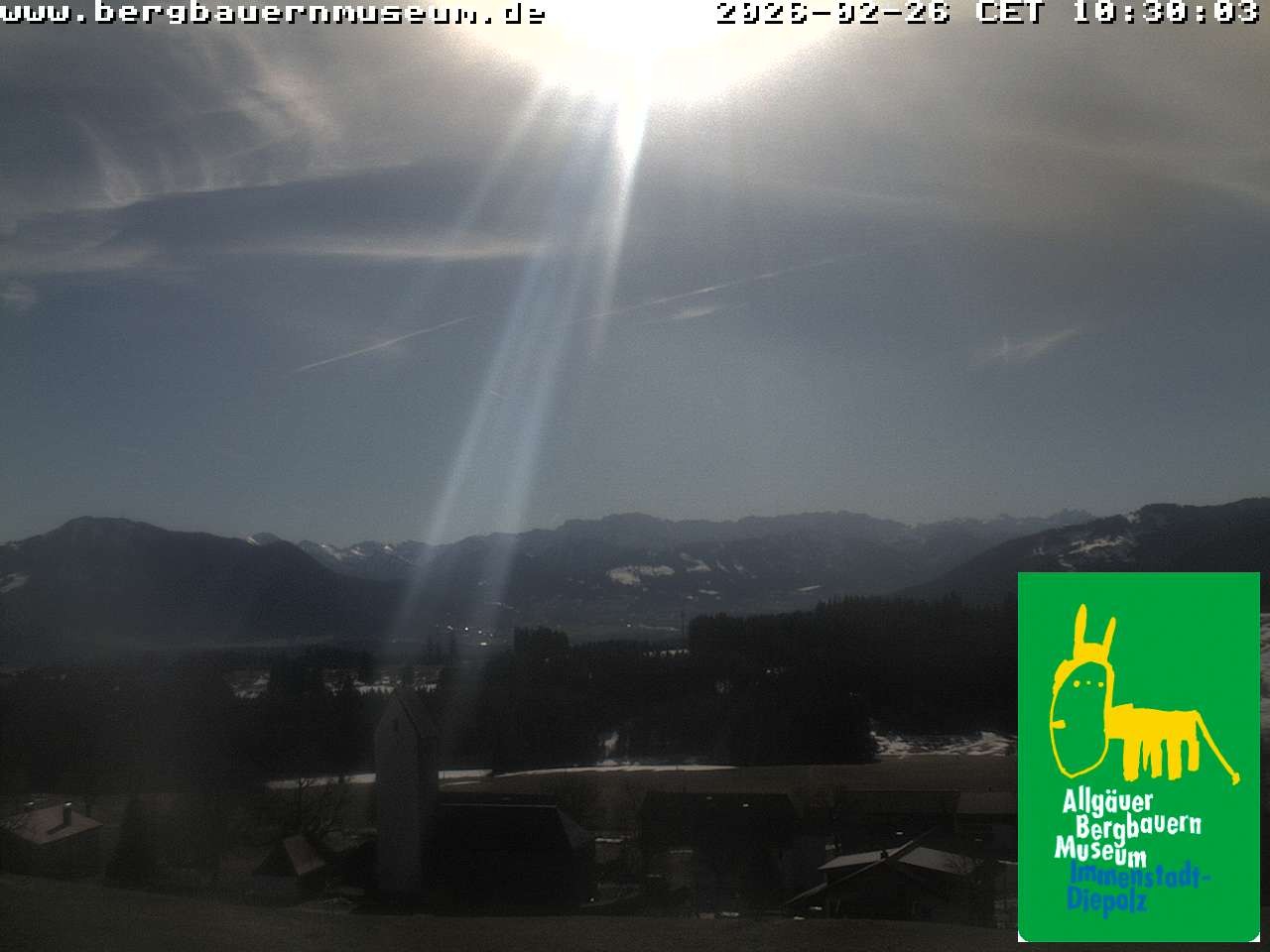 The webcam offers the view from alpine hut “Höfleaple“ that is located in the Museum of Mountain Farming in Diepolz (Allgäu). It shows the village Diepolz and the Allgäu Alps. The Höflealpe hosts an exhibition about the ancient work in the forest and provides information about poachers.