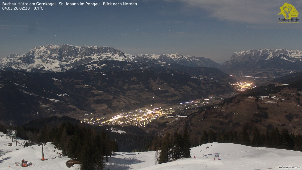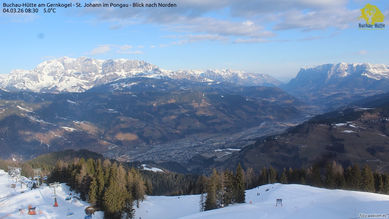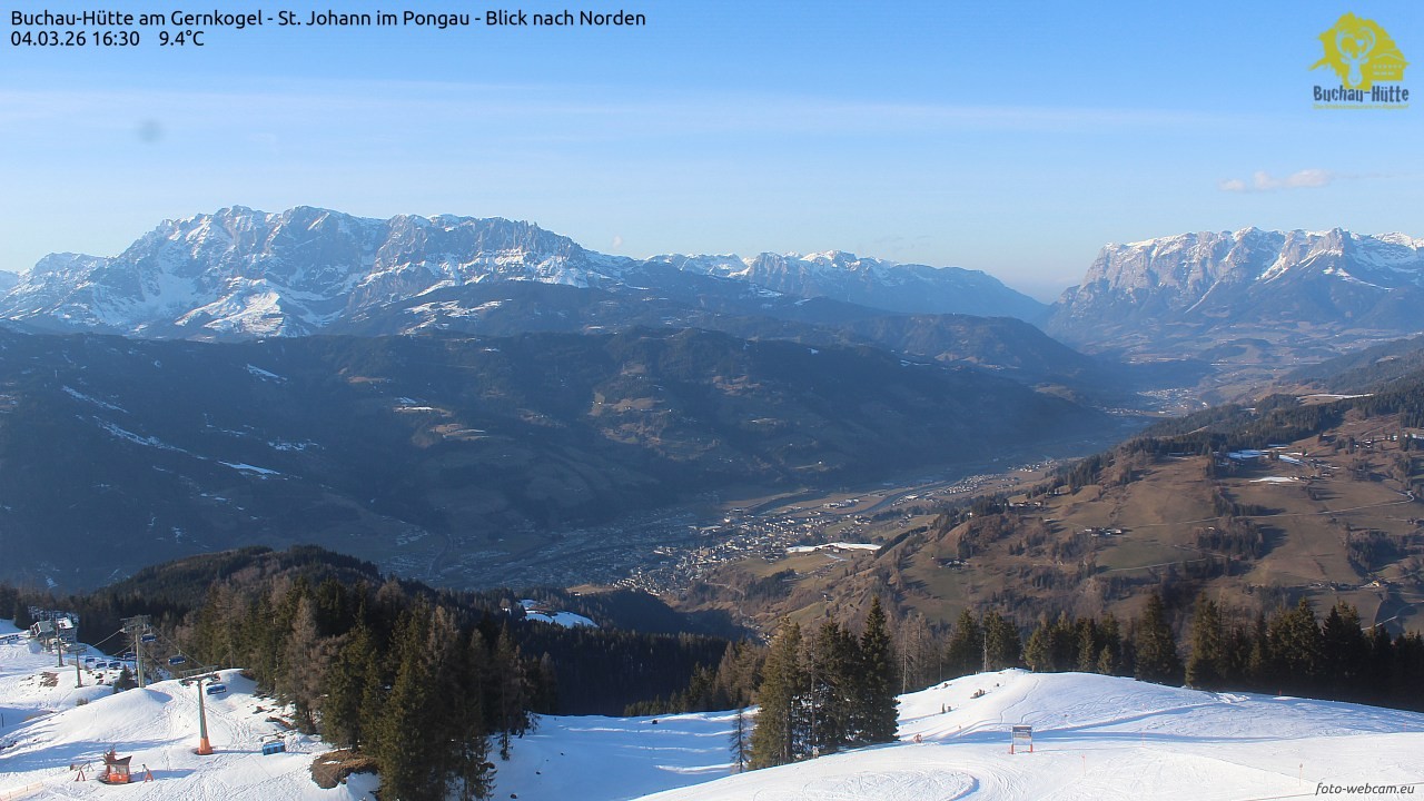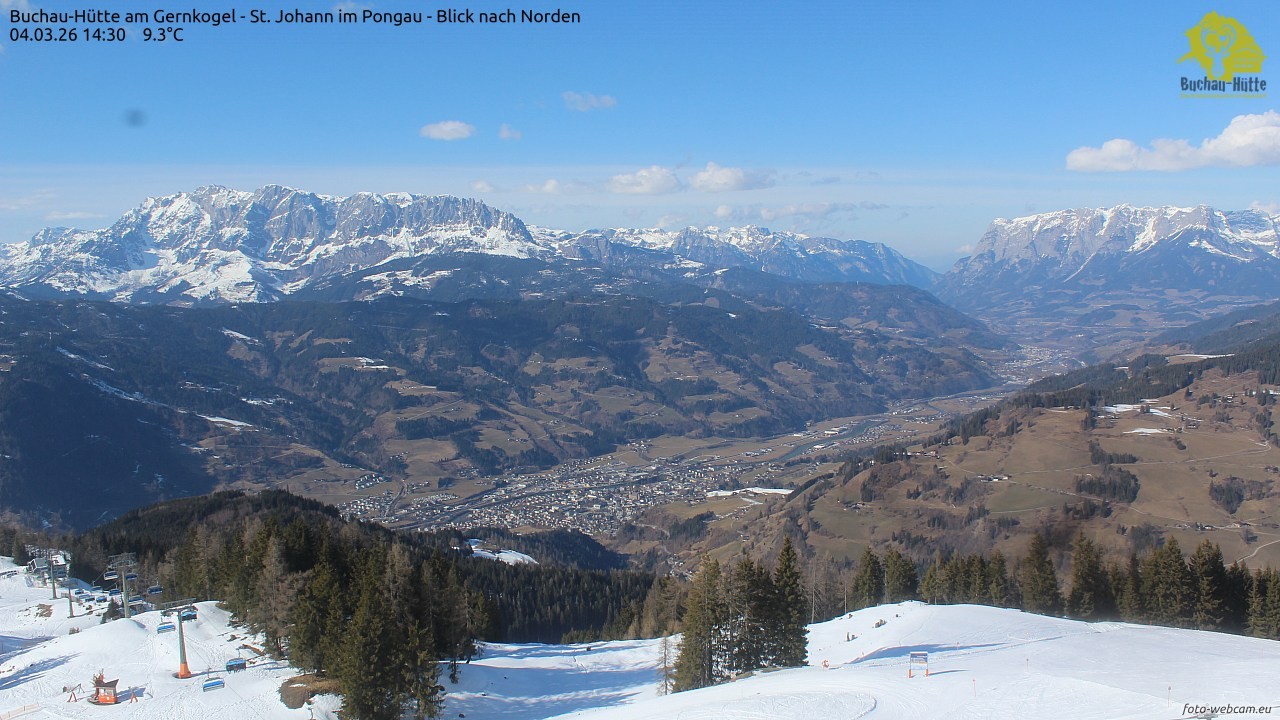 The webcam is located on top of the Gernkogel near St.Johann im Pongau and shows a great panoramic view of St. Johann and Bischofshofen. On the left you can see the Hochkönig and on the right is the Tennengebirge.