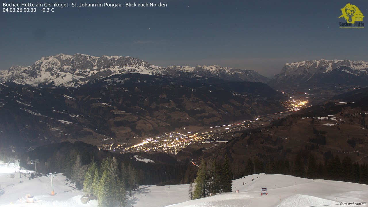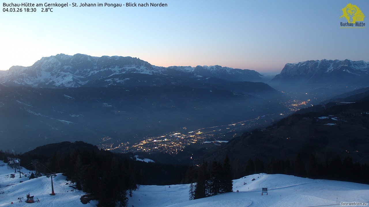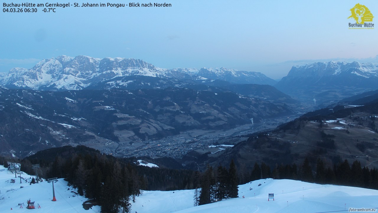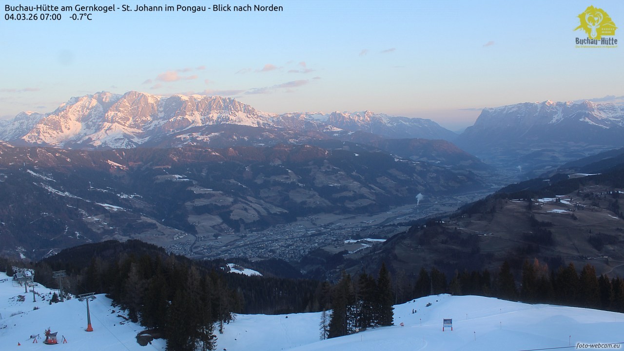 The webcam is located on top of the Gernkogel near St.Johann im Pongau and shows a great panoramic view of St. Johann and Bischofshofen. On the left you can see the Hochkönig and on the right is the Tennengebirge.
