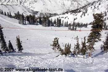 Snowbird is an experts’ dream come true. Pretty much all lifts access demanding “black” terrain which amount to 1/3 of all descents. Very skilled skiers should definitely pay the extra fee for the Aerial Tram as the terrain accessed is beautiful and challenging and will definitely leave you breathless. An extraordinary skiing experience is provided when snow cover is abundant, meaning when first tracks can be drawn through waist high powder (no exception by the way). The US and Canada are famous for tree-skiing. Snowbird of course is no stranger in the tree skiing department either. We can especially recommend the terrain made accessible by the “Aerial Tram” like the “Regulator Johnson” (long tree-free descent), the “Silver Fox” (diverse descent with few trees) or the “Dalton`s Draw” (steep terrain with lots of trees). In order to get to the “Thunder Bowl” deboard the “Gad 2 Lift” to the right. Only few skiers venture into these grounds. The Snowpark is also to be found in that part of the resort and does live up to any freestylers expectations. Also located there is the super-challenging descent which demands the expert skiers to overcome 650 height meters in steep terrain. Our only possible conclusion for Snowbird in the expert category: 5 stars, the highest award.