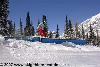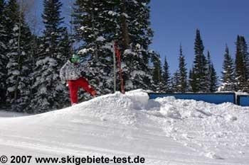 As aforementioned in the expert category, the Backcountry terrain will certainly enthuse any boarder. Those however who rather spend their day flying through the air than riding powder might be a little disappointed as not all ability levels are catered to by the terrain parks. At the “Mid-Gad-Lift” the beginner terrain park is located, for all those that are rather new to the air&style department. If you think the beginner terrain park lacks challenge you can transfer to the intermediate – and expert terrain park at the “Baby Thunder” lift. The park is composed of three smaller terrain parks which are separated into “jumps”, “rails” and “halfpipe”. The jumps (total of 5) are quite large and therefore recommendable only for skilled boarders. The last jump is suitable for non experts also. Most rails in the park were unfortunately closed at the time of testing. Some have large gaps and are therefore difficult to slide. The half-pipe was missing during the entire last winters`s season. Those that attach importance to the existence of a half-pipe should check the internet-page before travelling to Snowbird. Sole small downer is the large gap between the two terrain parks level of difficulty. Althogether Snowbird obtained excellent 4 stars in the snowboarder category.