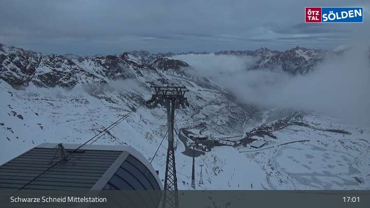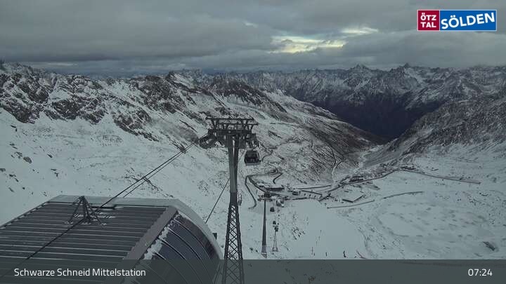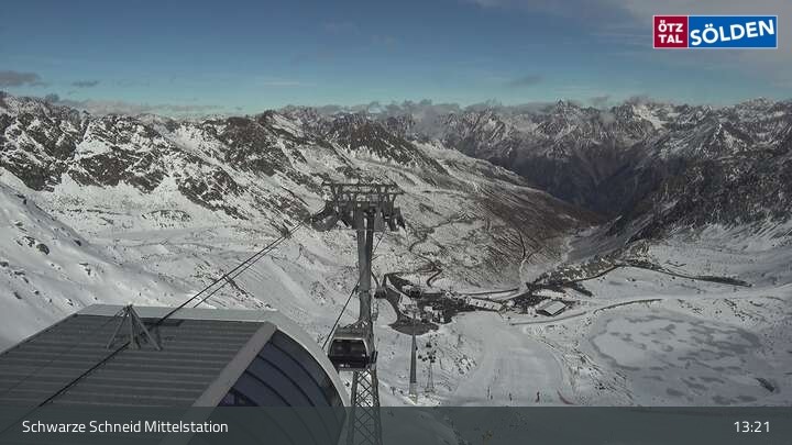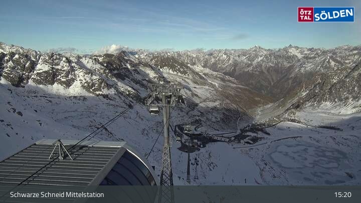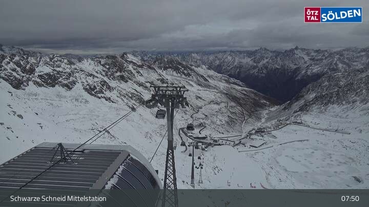 The camera is located at the middle station of the Schwarze Schneid gondola lift on the Rettenbach glacier in Sölden. You can see the World Cup downhill run.
