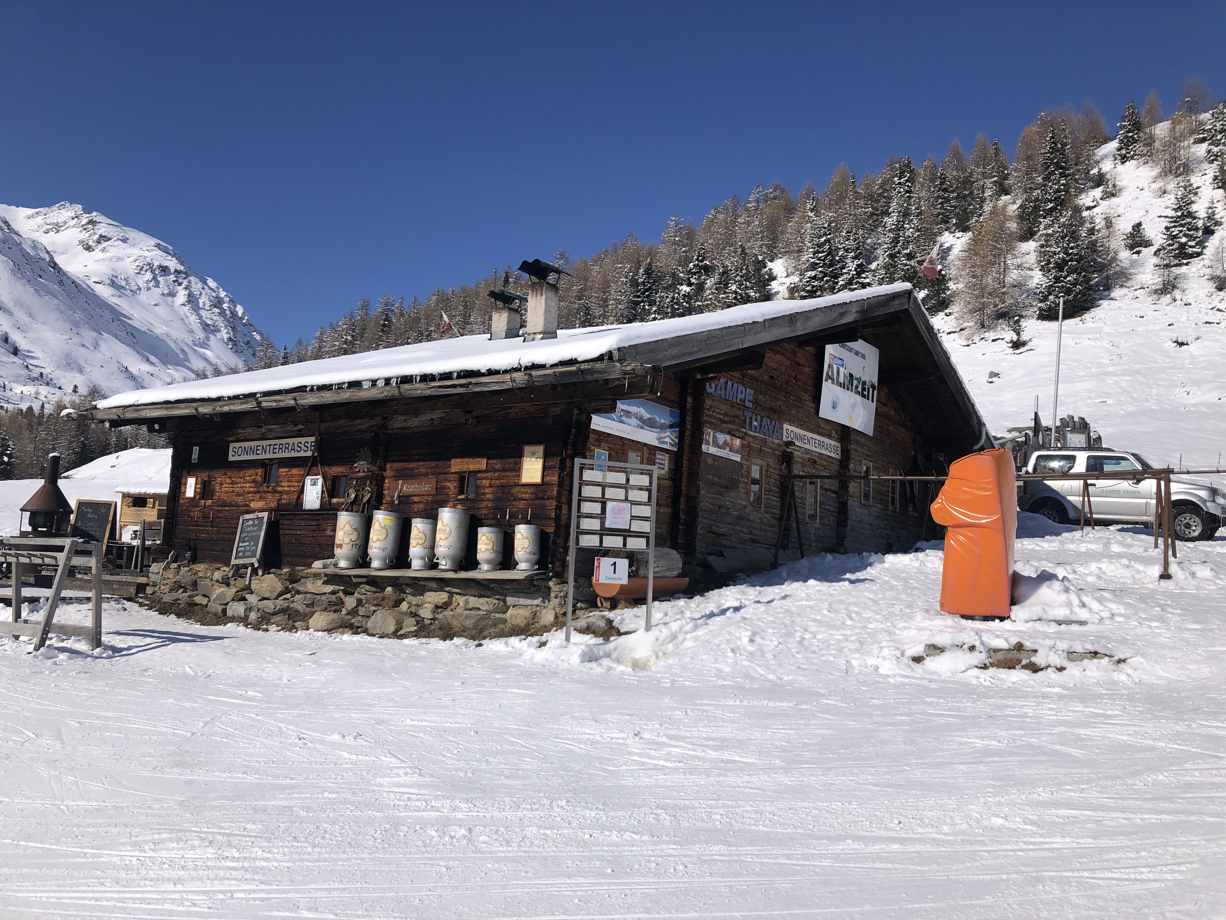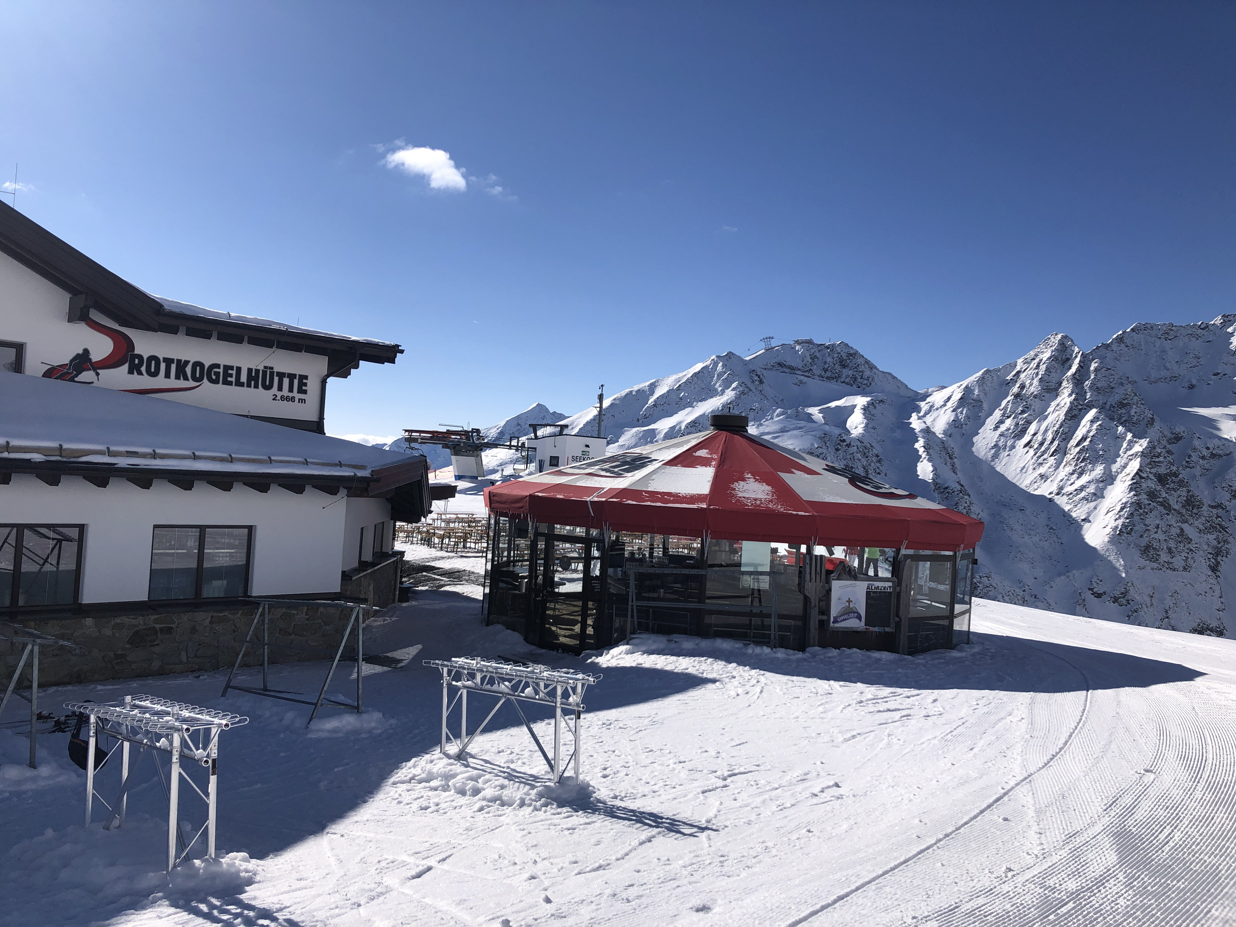 You can enjoy a brilliant view in the restaurant Schwarzkogl. The impressive Rettenbach glacier is within reach here. In addition to the large restaurants, however, there are also smaller, rustic huts to choose from, such as the Gampe Alm with its sunny terrace on red run no. 11 or the Gampe Thaya opposite. The Hühnersteign on piste no. 30 is also cozy.