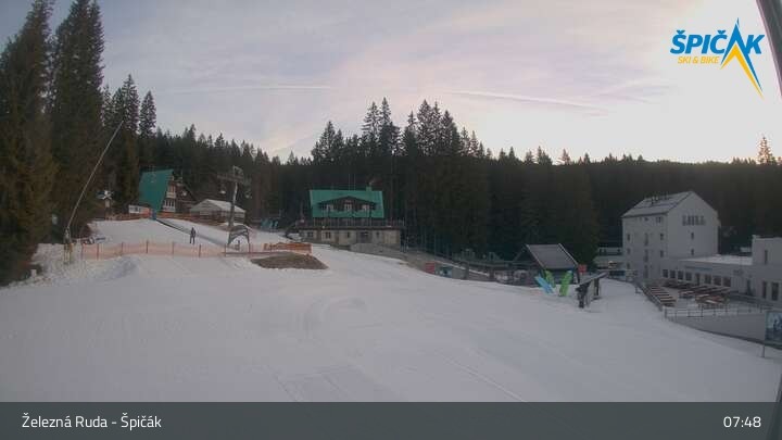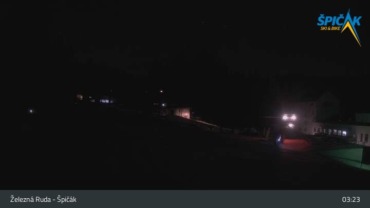 The webcam shows the base station of the chairlift in the Czech ski resort Špičák near Železná Ruda.