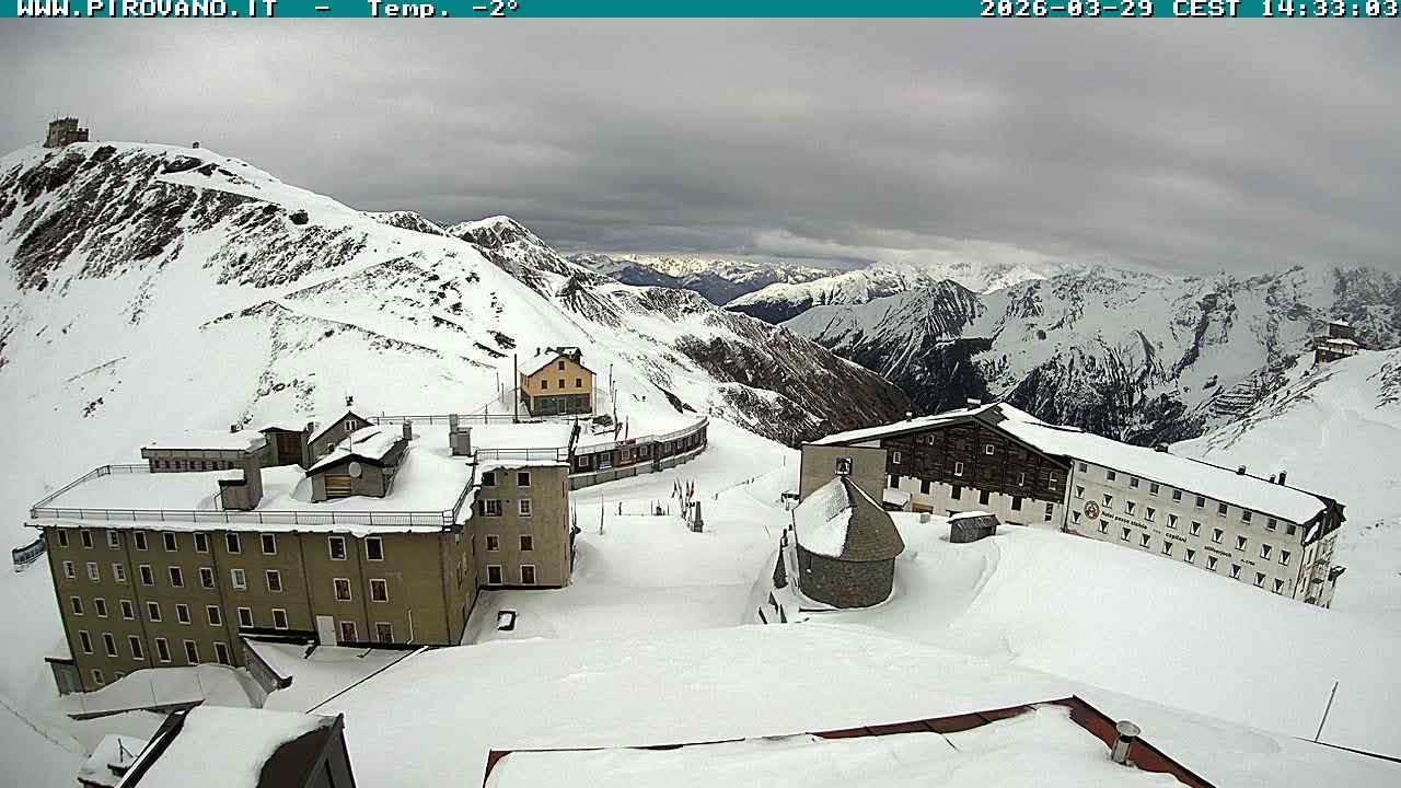 Archived webcam image showing Albergo Quarto Pirovano, Passo Stelvio on 29 Mar 2026 at 14:08 13:00