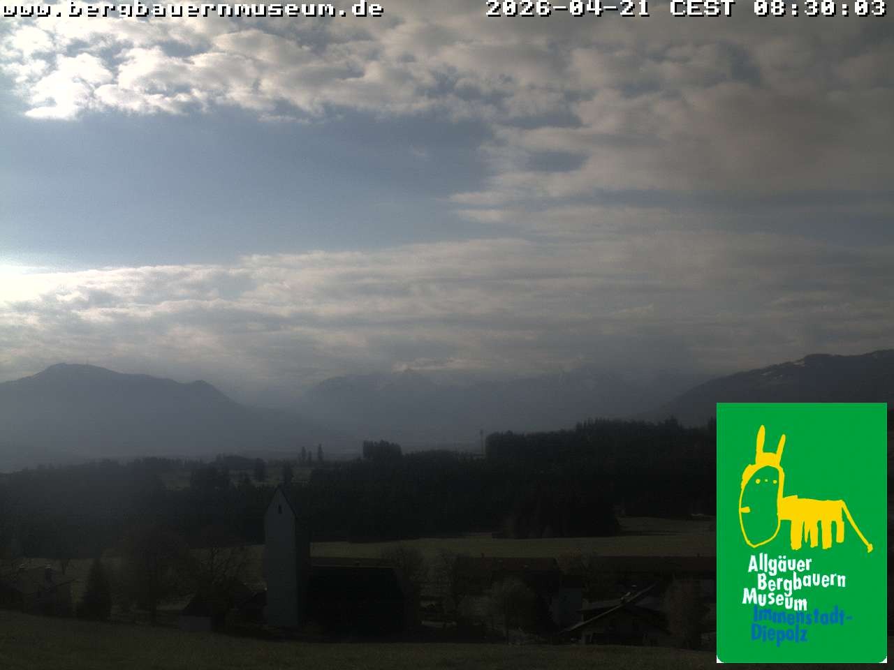 The webcam offers the view from alpine hut “Höfleaple“ that is located in the Museum of Mountain Farming in Diepolz (Allgäu). It shows the village Diepolz and the Allgäu Alps. The Höflealpe hosts an exhibition about the ancient work in the forest and provides information about poachers.