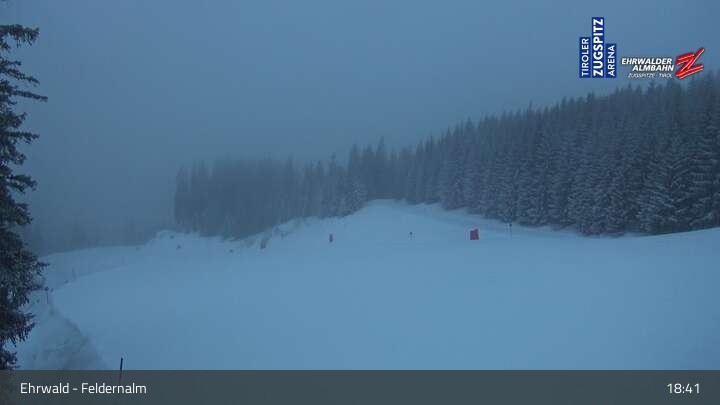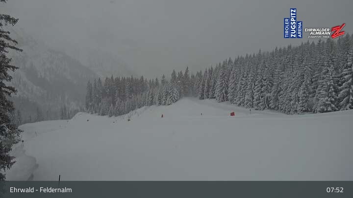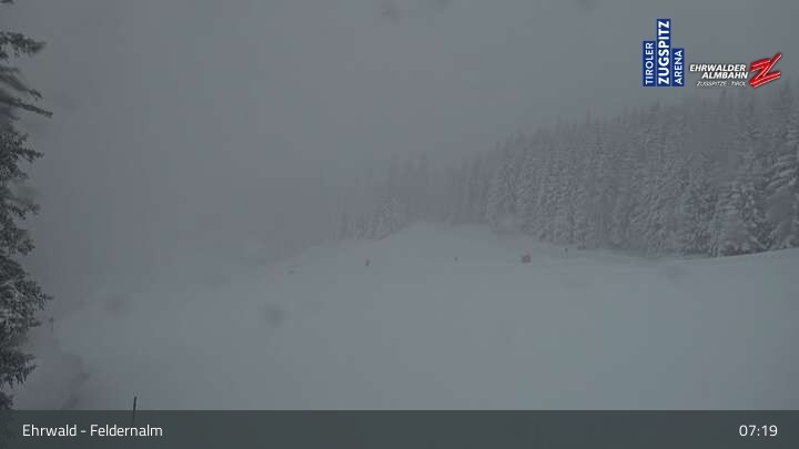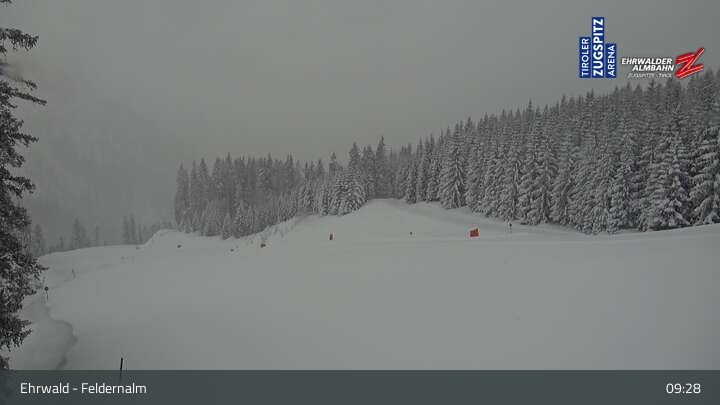 The webcam shows the surroundings of the Feldernalm in the skiing area Ehrwald at Tiroler Zugspitzarena.