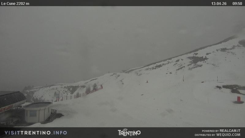 Located at the mountain hut Le Cune in the ski resort Alpe Lusia in Val di Fiemme, the webcam faces the Ronchi-Valbona lift.