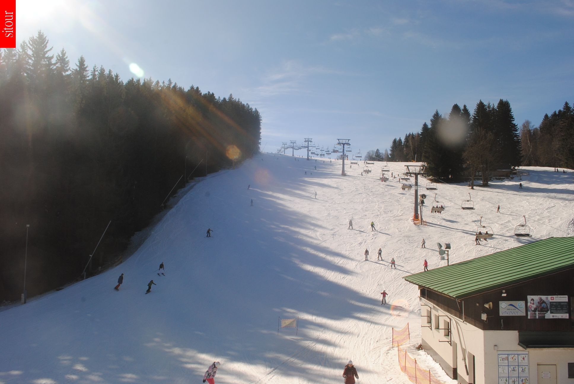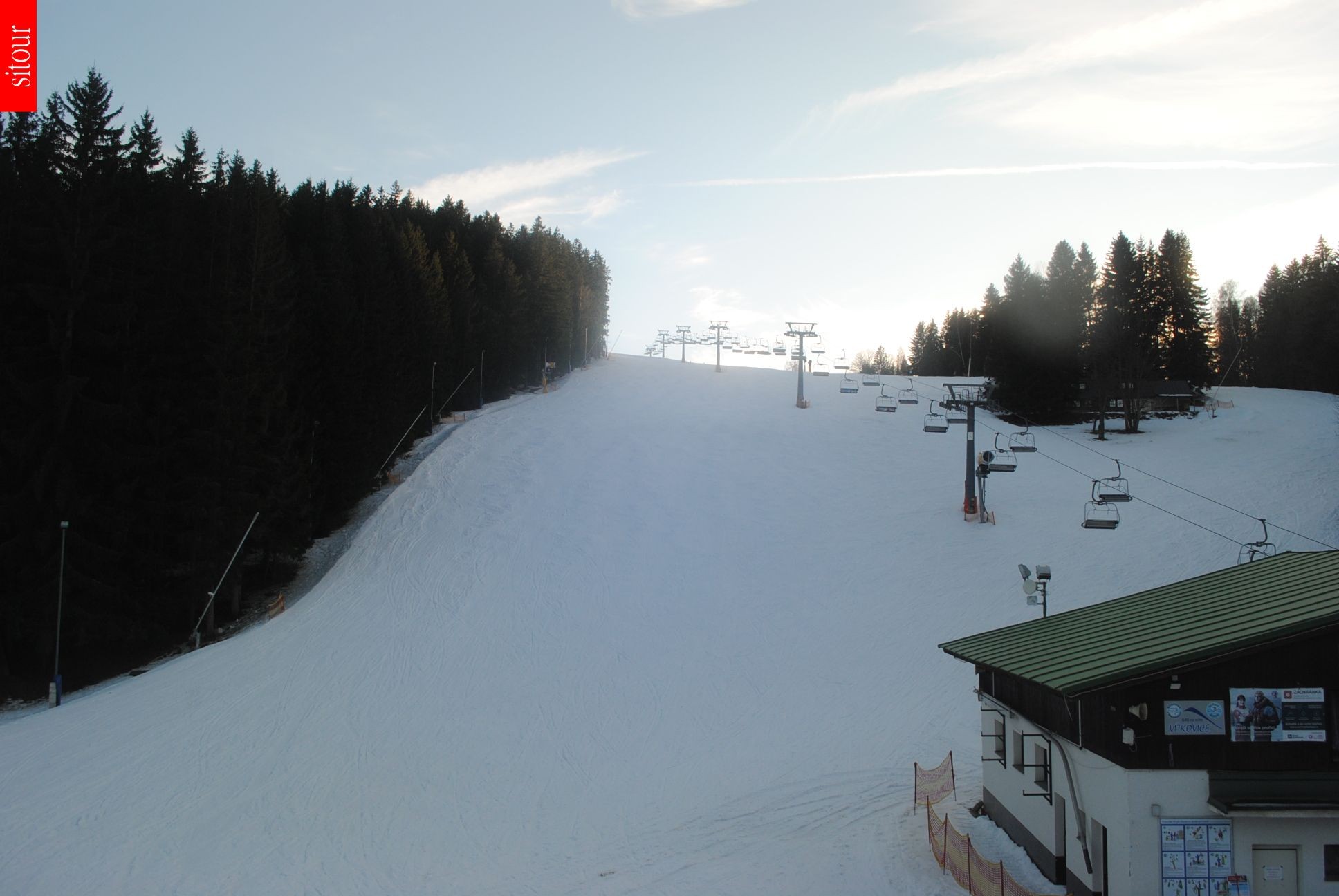 Located at the base station of the chair lift Prezidentský expres the webcam is looking towards the slopes Šárky Záhrobské, Václav and Gizela at the ski area Vítkovice Aldrov.