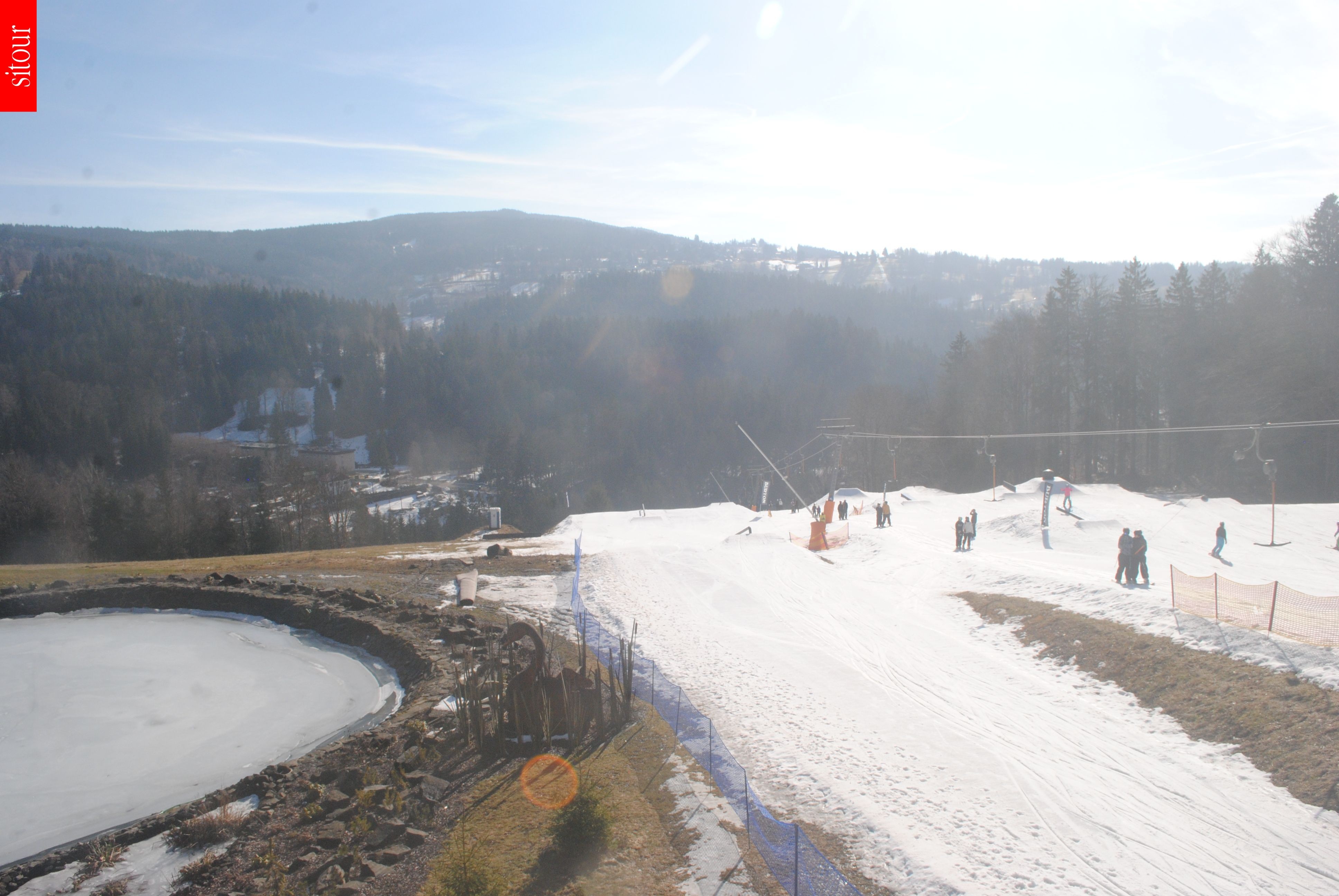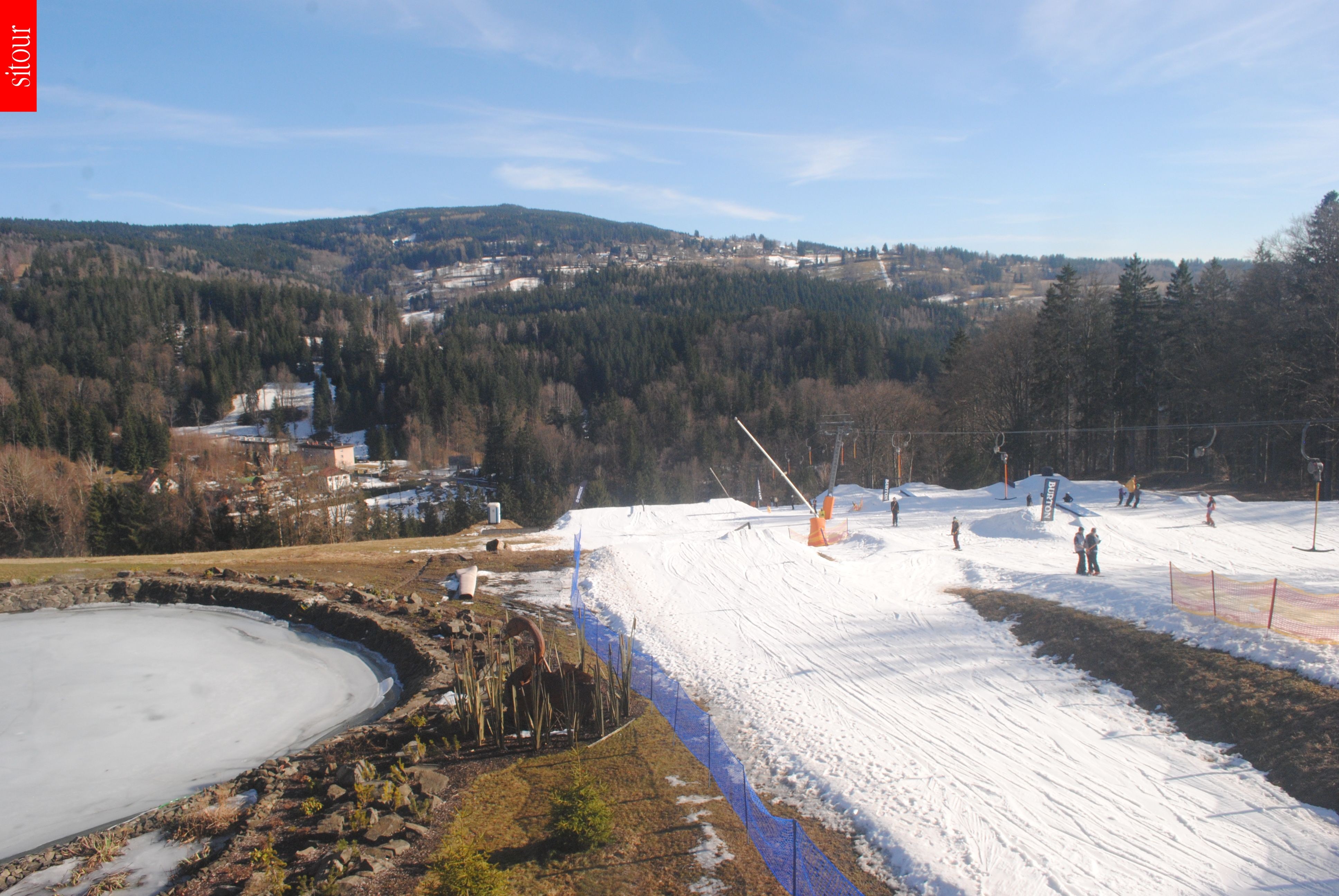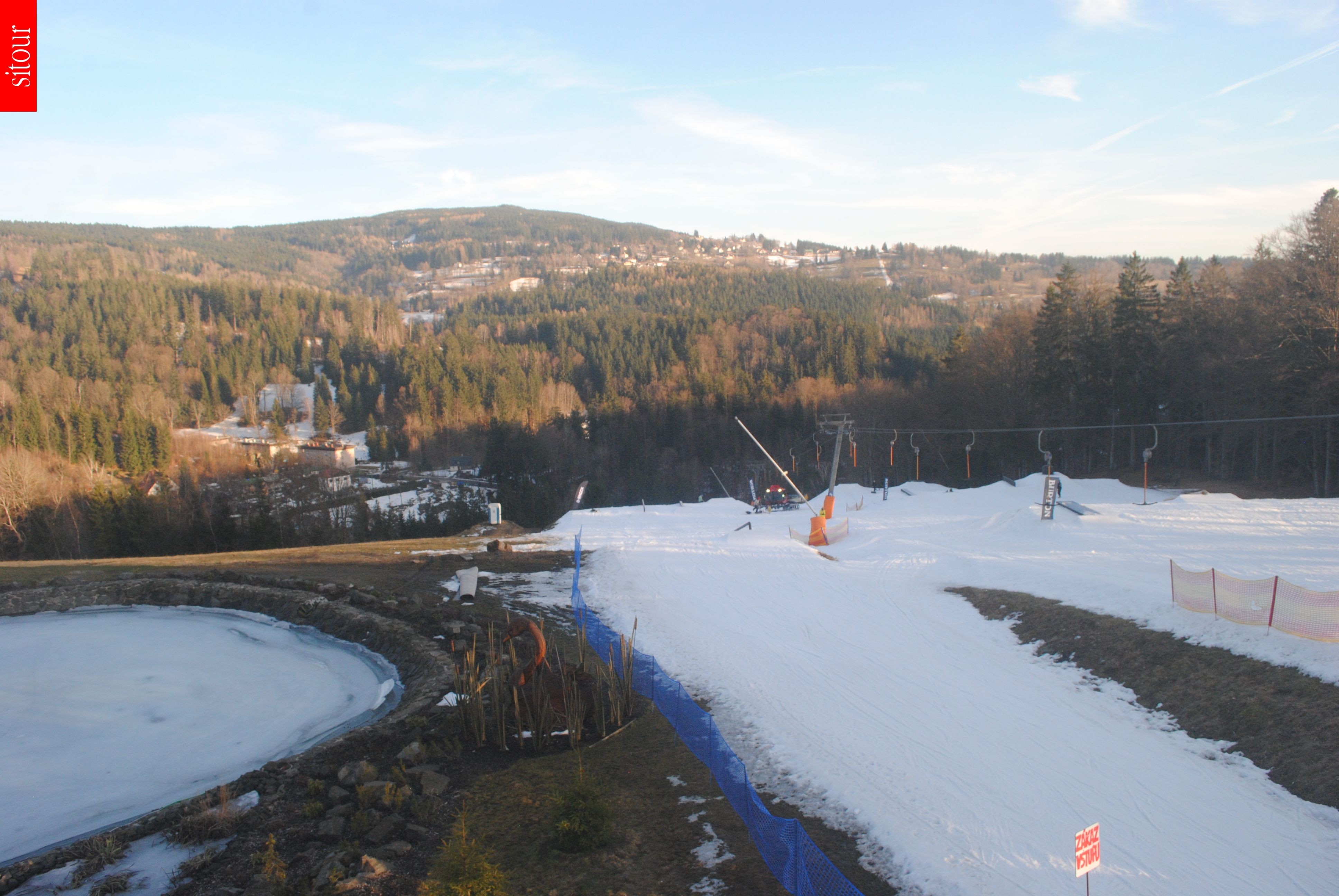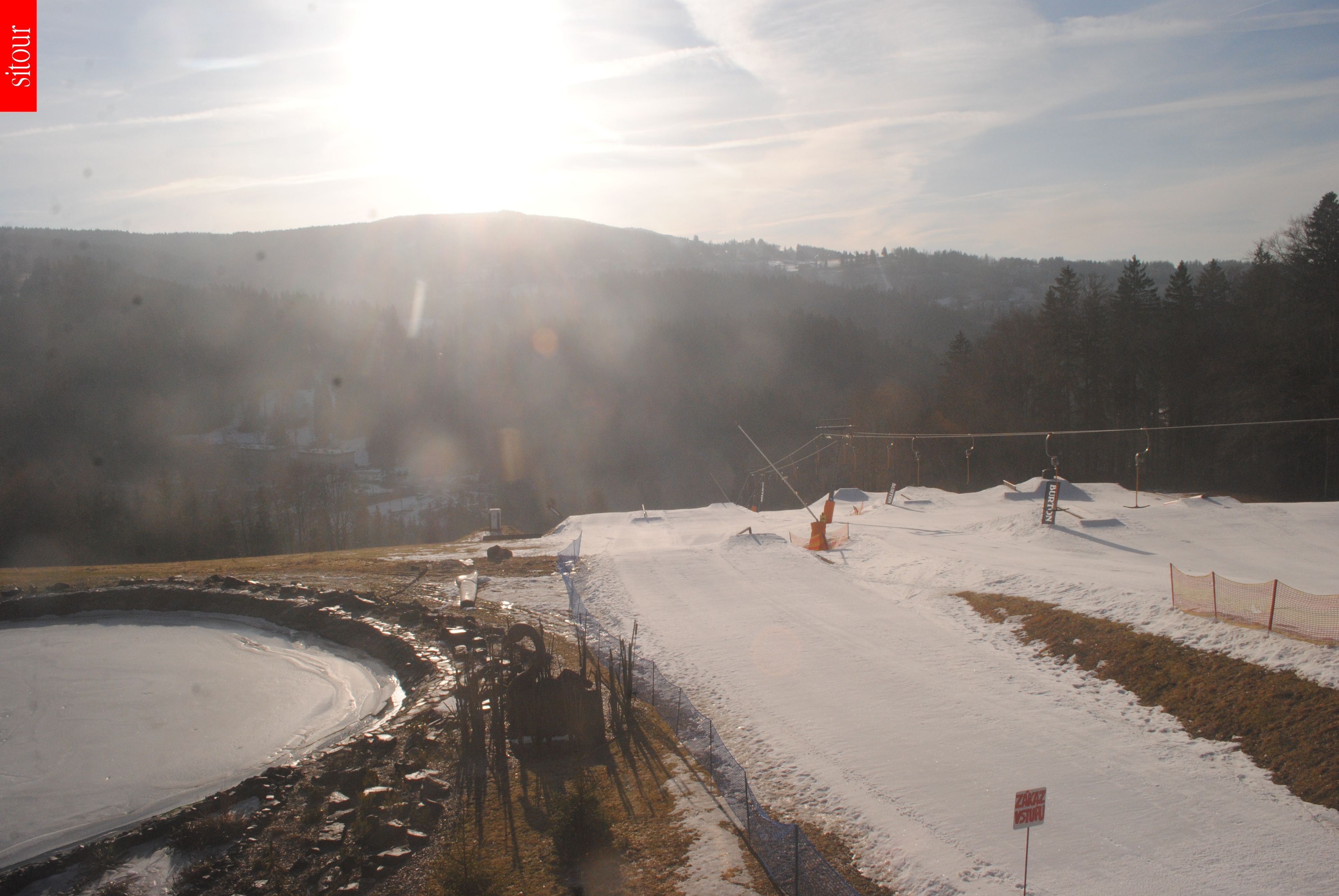 Located at the top station of the Jizerka draglift the webcam shows the snowpark of the Czech ski area Vítkovice Aldrov.