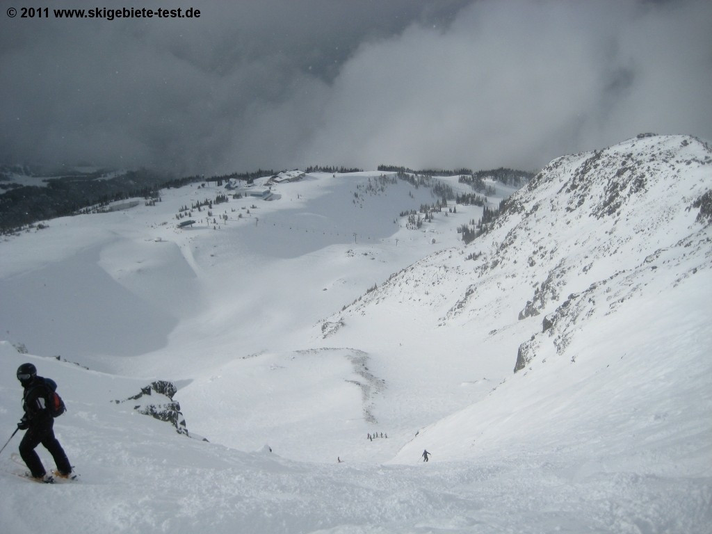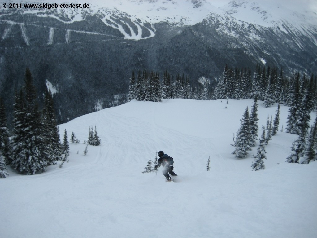 On Whistler, freeriders will be best served in the area around the Peak chairlift. We especially recommend the Whistler, West and Bagel bowls. If you’re still not worn out after those, give the nearby Dusty’s Descent, Big Timber or Homerun (all of which run back down to Creekside’s base terminal) a go. Further highlights on Whistler are the Flute Bowls, which you can access via a ca. 20 minute trip on the Symphony Express chairlift.