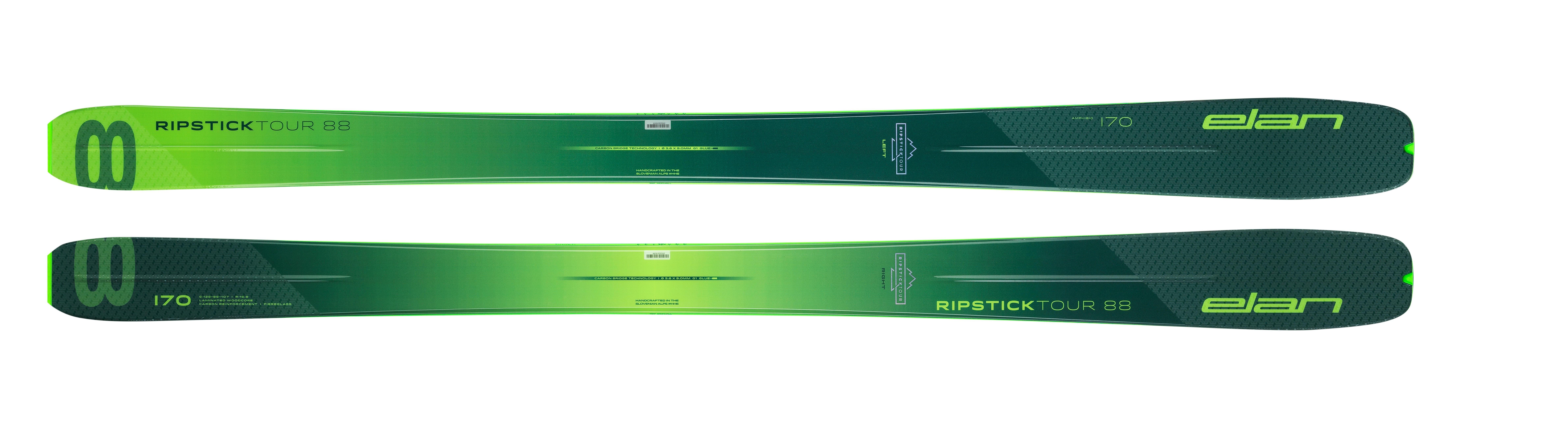 Designed with our freeride athletes and guides that demand perfection everywhere they go, it's ground-breaking construction has allowed Elan to drop the weight to a minimum and push performance to the maximum, while maintaining a playful feel for all aspects of the journey. This 88mm waisted ski is very light and easy to maneuver, yet deftly capable, making it a true modern touring ski. The free touring segment is the trend in alpinism; combining light equipment that performs in powder and remains stable in variable conditions is essential. The Ripstick Tour 88 is the perfect waist to feel confident on descents and narrow enough to enjoy comfortable, long uphill ascents, making it the sweet spot for touring skis. At approximately 1250 g per ski in length 170 cm they've targeted the optimal weight for a touring ski, without sacrificing downhill stability and performance. When paired with the 305 g C-RAIDER tech binding and Ripstick Tour 88 skin, there is a complete, lightweight package, that will perform and inspire. With carefully designed Carbon Bridge Technology, Elan implemented a carbon rod reinforcement to connect the energy of the ski for a smooth feel with playful rebound. The length of the reinforcement is designed to exact measures to reduce vibration and tip chatter. A reduced sidewall shape gives the ski a unique look with functional weight reduction, while full sidewalls increase edge pressure and contact. With a freeride profile and shape, Elan has assured this is the perfect combination of weight to performance ratio for all skiers, in any conditions found in the backcountry.