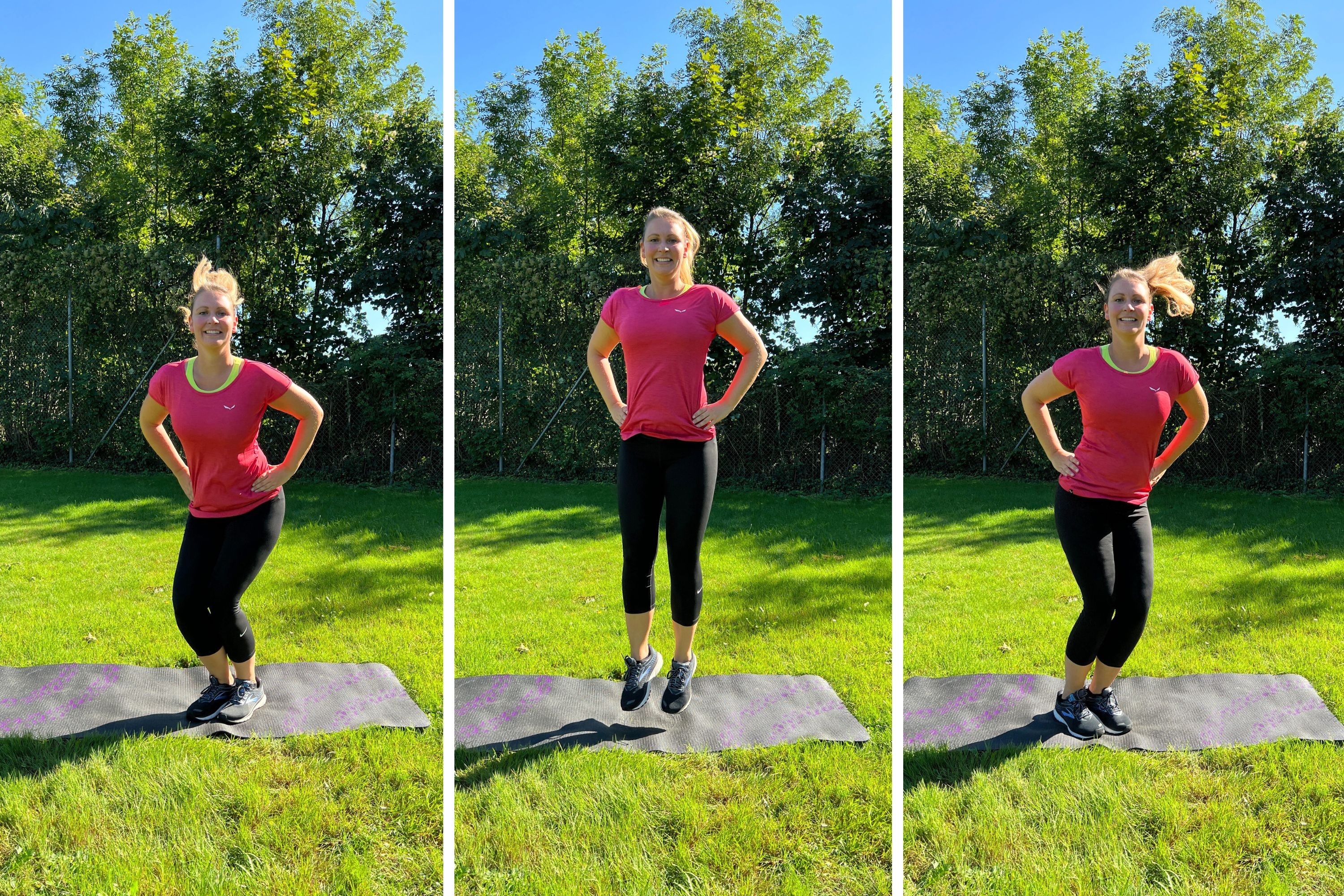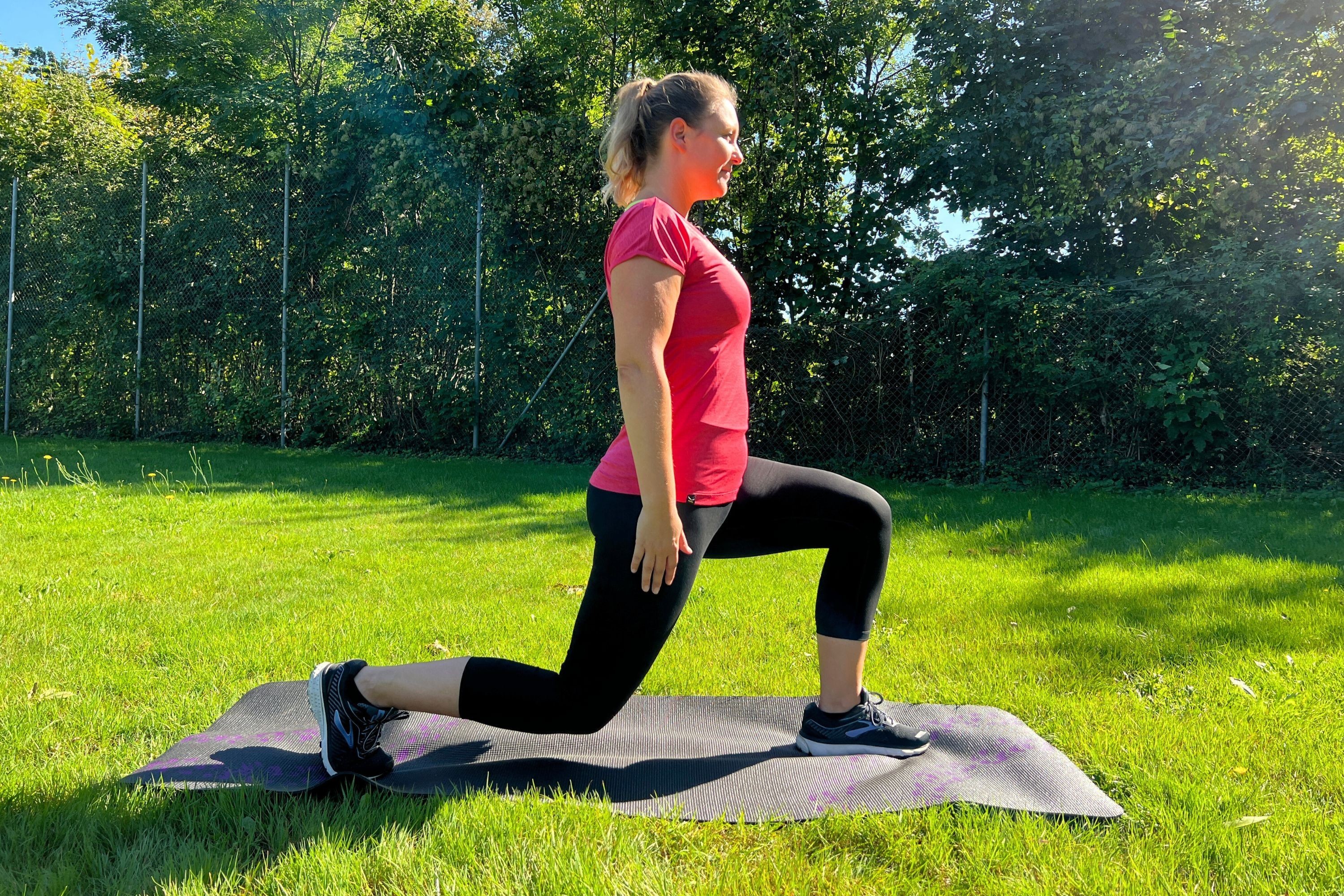The downhill position helps strengthen your thigh muscles and stabilise your centre. Just bend your knees into downhill position (feet hip-width apart, lowering your bottom), and stay there for 20 to 40 seconds. Abs are contracted, the upper body is long. You can stabilise the position taking the arms up or in front. Repeat the exercise three times. If you want a little more, shift your weight onto one leg, alternating between left and right.