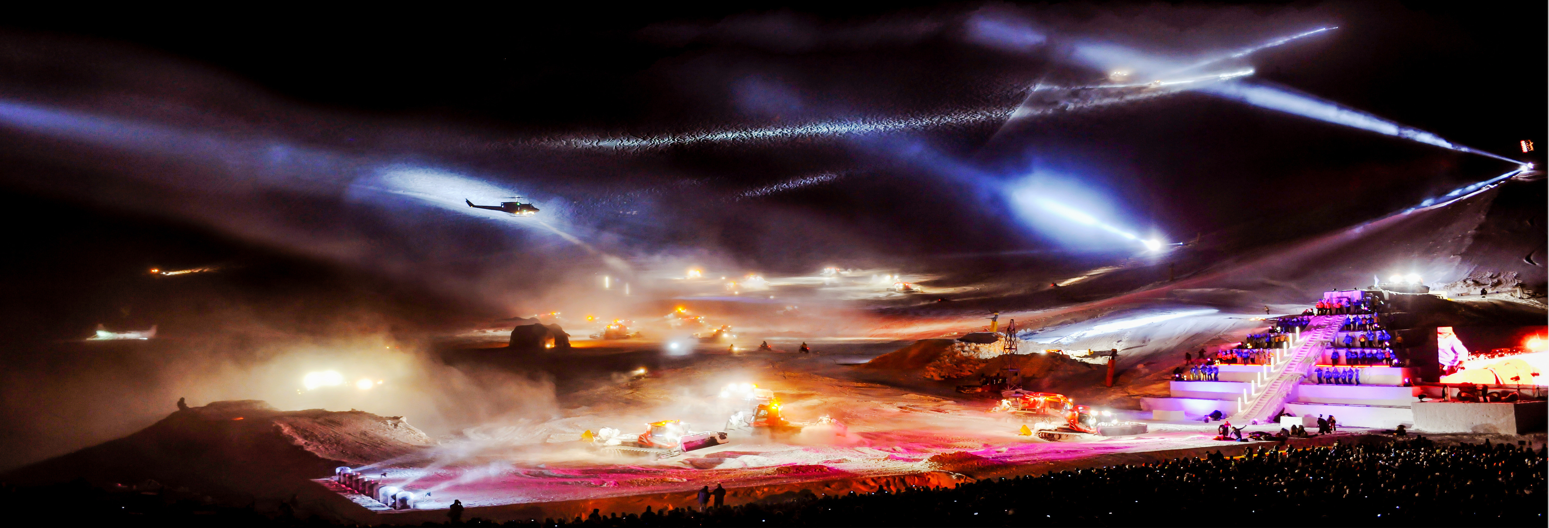 This exact story is brought back to life in Sölden on the 12th April 2019 - almost 10,000 ft above sea level! Rettenbach glacier is the backdrop of this spectacle, spreading out on 185 degrees as the largest natural show stage in the world. No movie screen can keep up with that. Snow groomers, planes, and helicopters are part of the show alongside actors, paragliders, and avalanches.