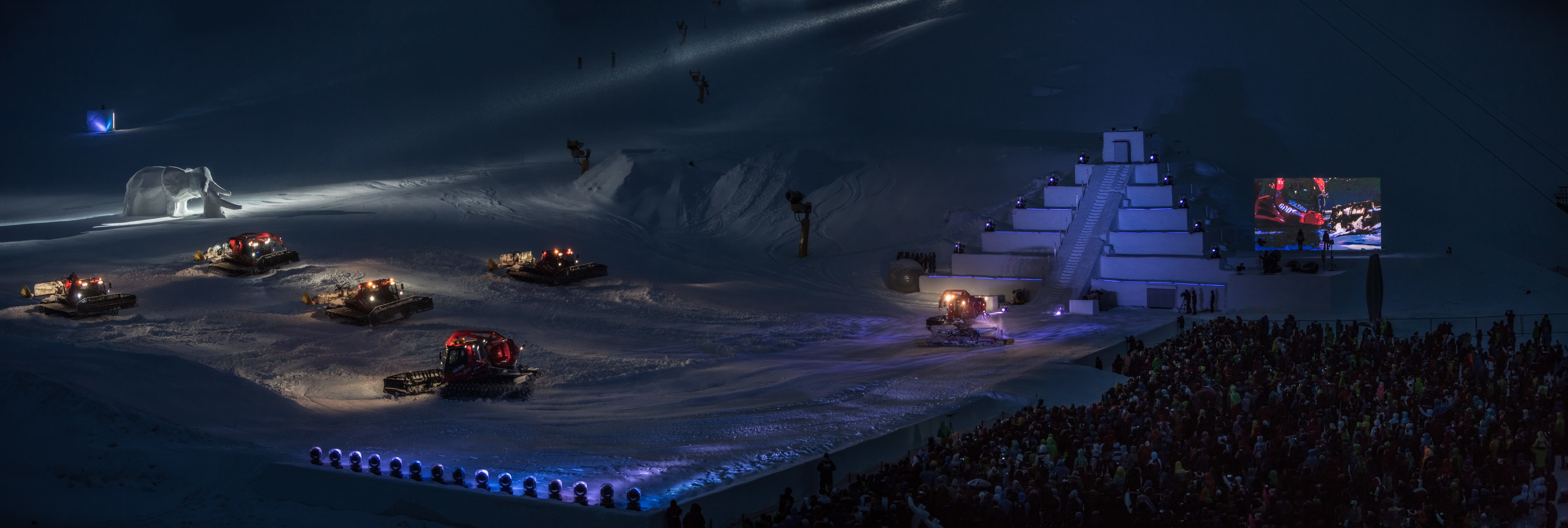 Starting at 7.30 pm, snow groomers turn into elephants in the dusk, 150 ski teachers wag down the slopes as African desert tribes, and Hannibal himself thrones on a moving tower. Faraway scenes are brought closer to the spectators with a giant video wall next to the 30 ft high step pyramid. The story is told by the Austrian actor Harald Krassnitzer.