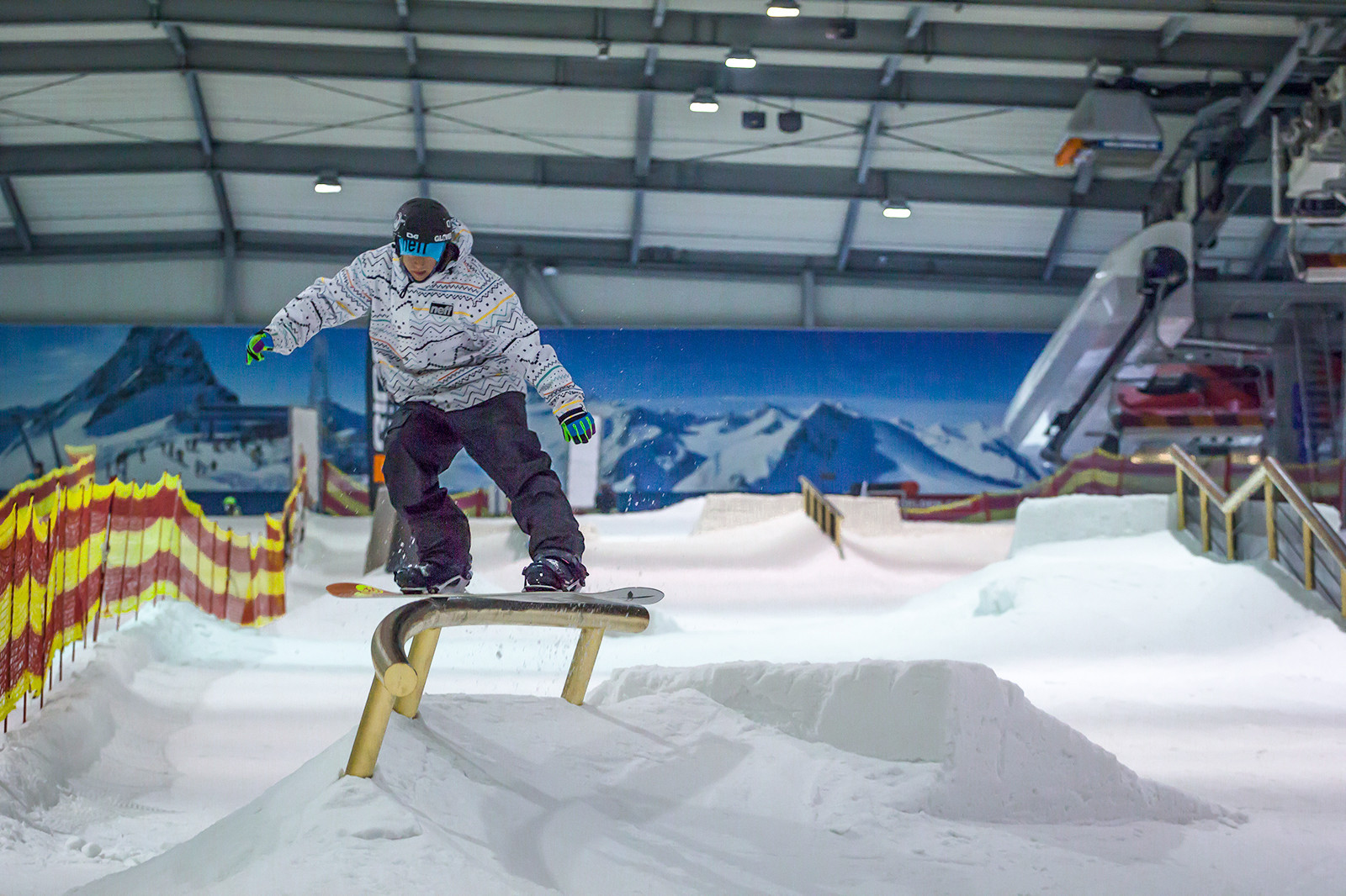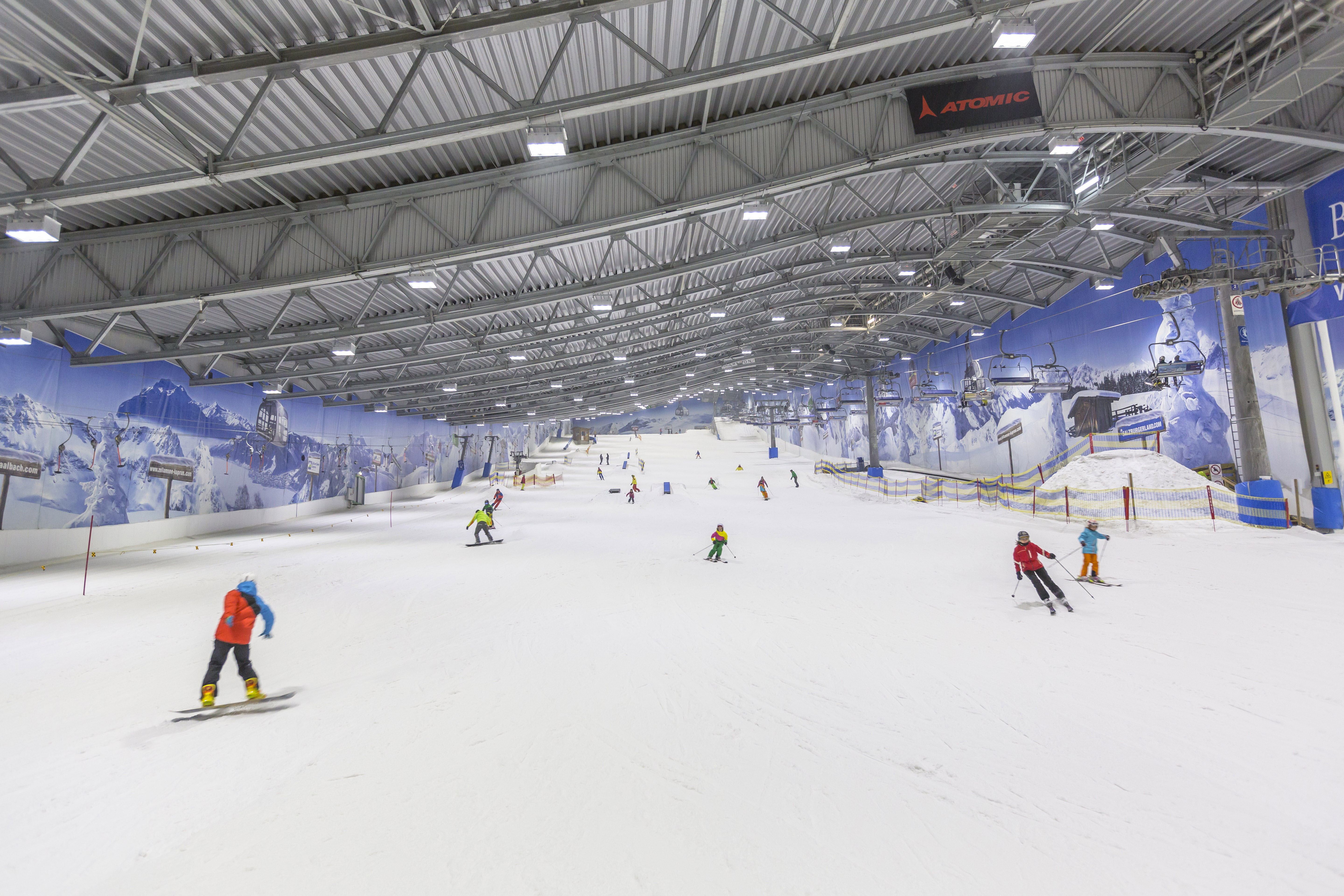 The Alpenpark Neuss near Düsseldorf weighs in with a truly unique feature – real powder! The roof of the hall features twelve integrated snow cannons, dusting the slopes with freshies at regular intervals. The runs include a mellow trail for beginners and kids, and a more challenging main run with a 28-percent gradient. A 4-person chair lift, two surface lifts and several magic carpet lifts are on hand to take skiers back up the hill. The terrain park is equipped with a range of features like rails and jumps, offering plenty of fun for freestylers of all abilities. And if you should get hungry, the cosy atmosphere of the “Salzburger Hochalm” or “Jausenstadl” is never too far away.