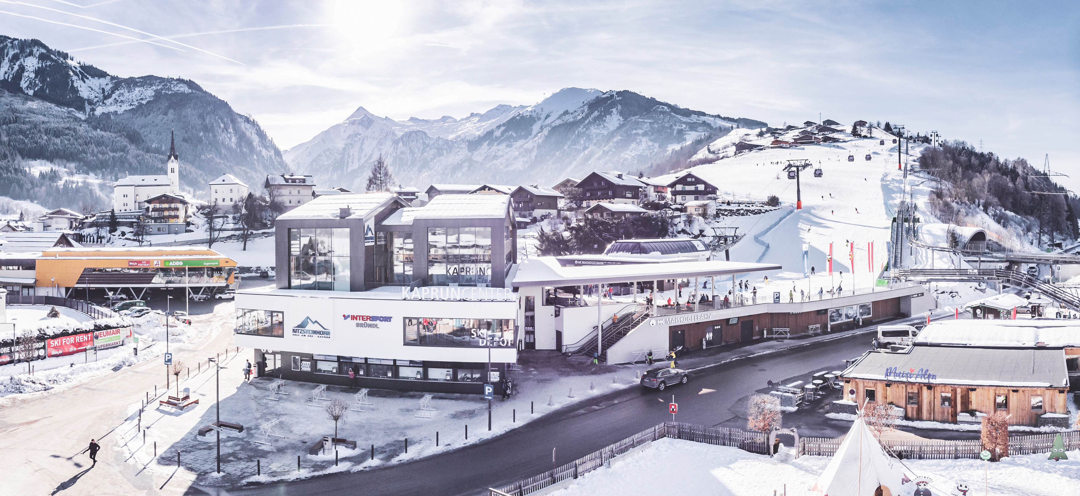 The new combined ski area will present two opportunities of entrance. Locals and hotel guests in Kaprun will of course use the Ski-In-Ski-Out in the village, being able to reach the new Kaprun-Center on foot. Not only the valley station of the Maiskogelbahn can be found here, but also a ski storage area for 2,000 pairs of skis, a large sports and rental store as well as free parking spaces.