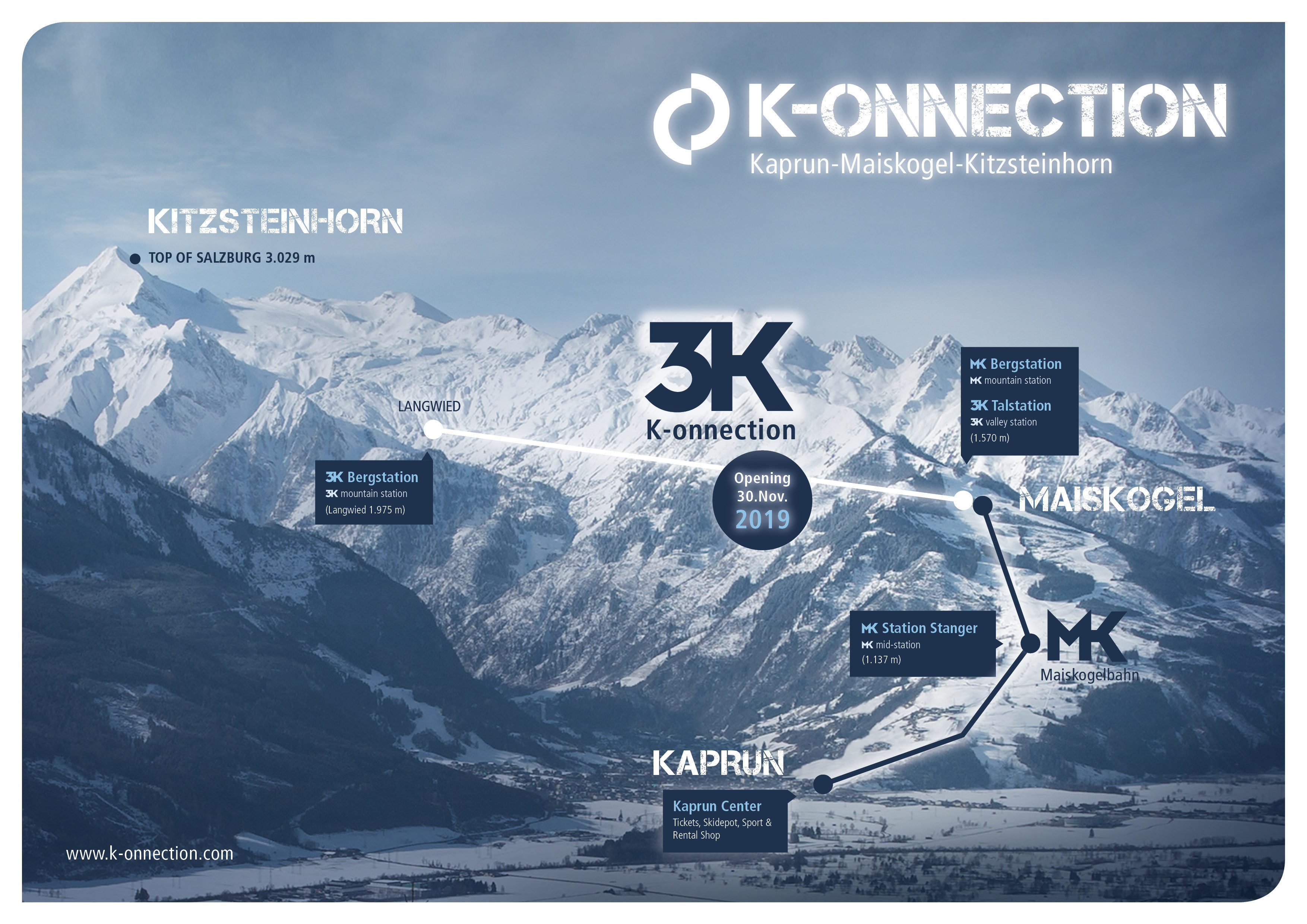 On November 30 this year, the long-awaited 3K-lift is expected to begin operating, completing the tremendous axis of aerial lifts. The “K-onnection” including the Maiskogelbahn, which was opened last year together with the Kaprun-Center, will connect the village center to the Kitzsteinhorn Glacier.