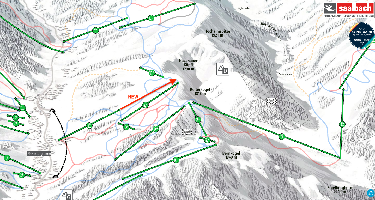 With this project, Saalbach is embracing cutting-edge cable car technology from Doppelmayr. The new 10-person monocable detachable gondola has a capacity of up to 2,500 passengers per hour and runs along a route of approximately 2.1 kilometers, climbing nearly 670 vertical meters.