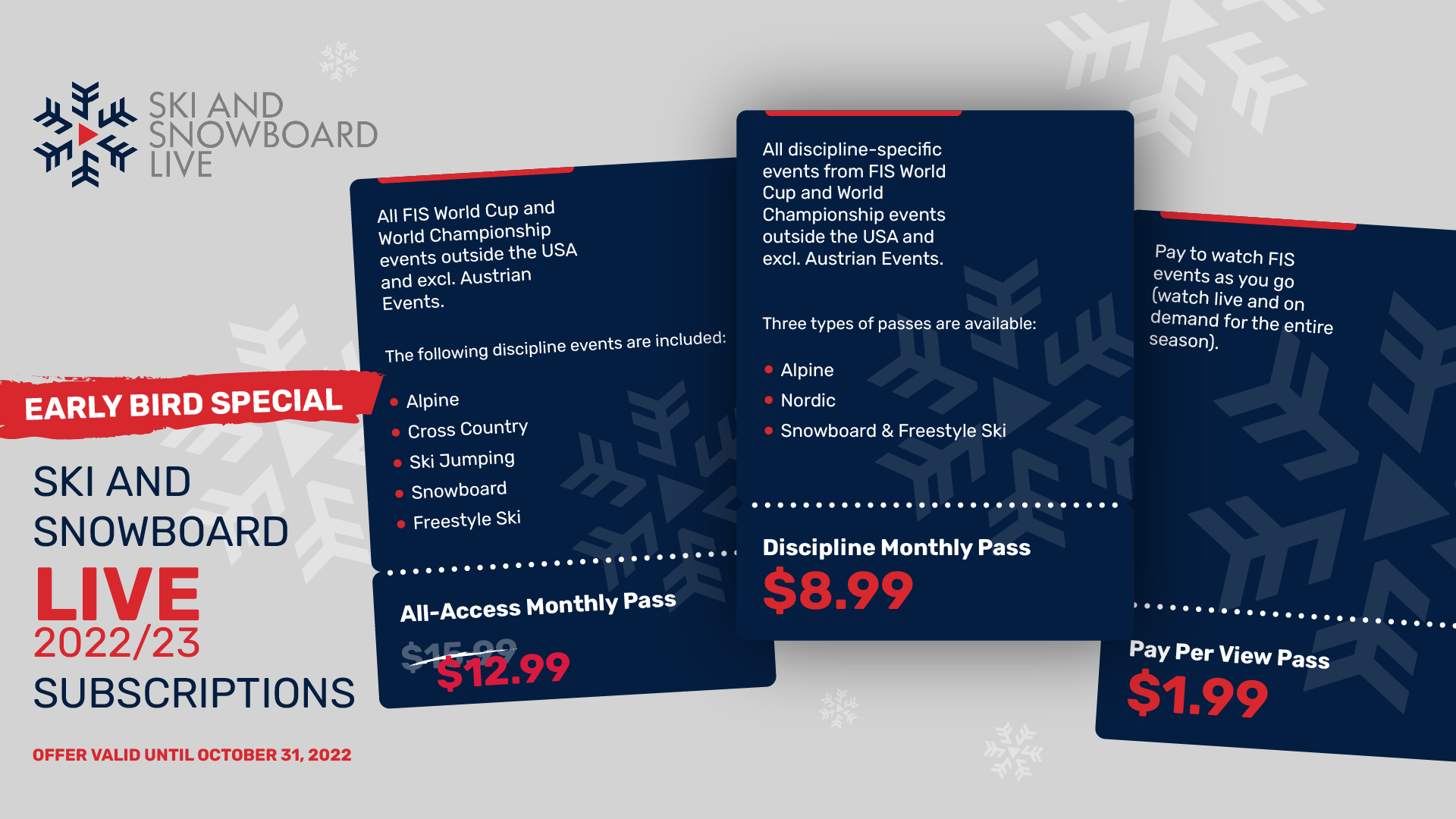 | Discipline-Specific Pass | all Alpine, Nordics or Snowboard & Freestyle Ski events with full on-demand replays | $8.99 |