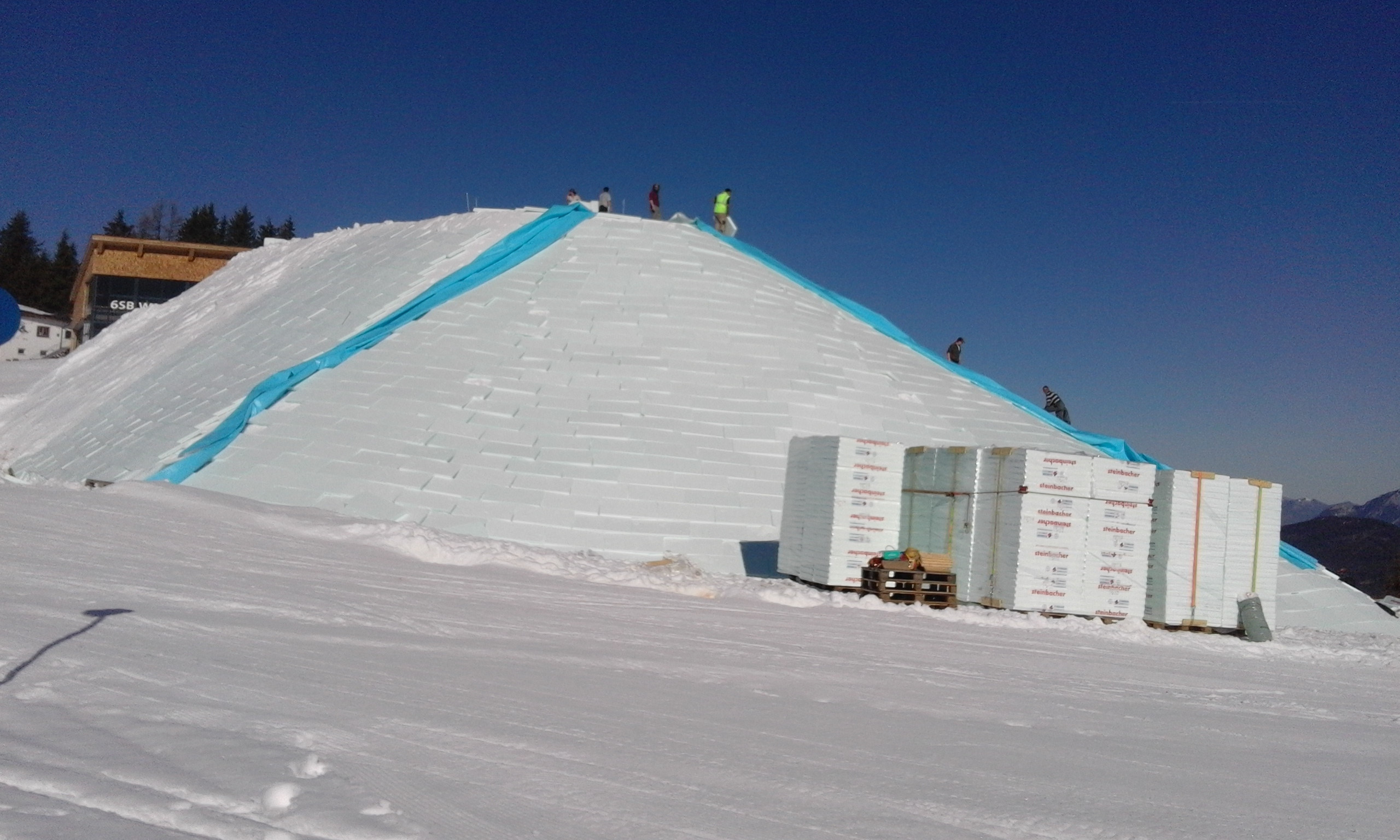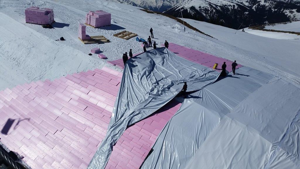 Afterwards, the snow depot is insulated with hard foam boards or in deeper layers (e. g. for the use in cross-country skiing areas) with wood chips or sawdust. To additionally protect the snow from water ingress, a silo foil is laid over it. The last layer consists of fleece, which protects the snow from sun and UV radiation.