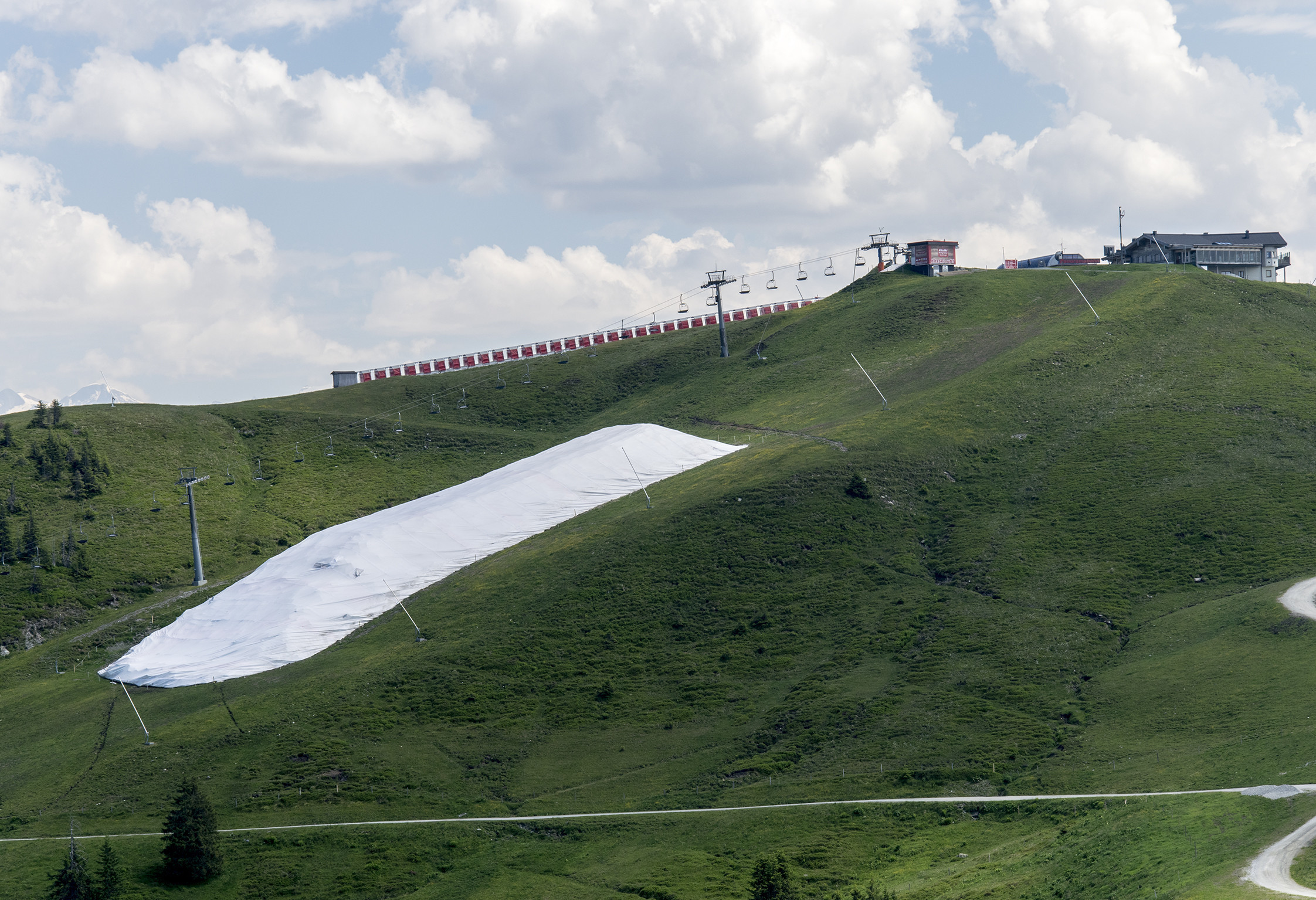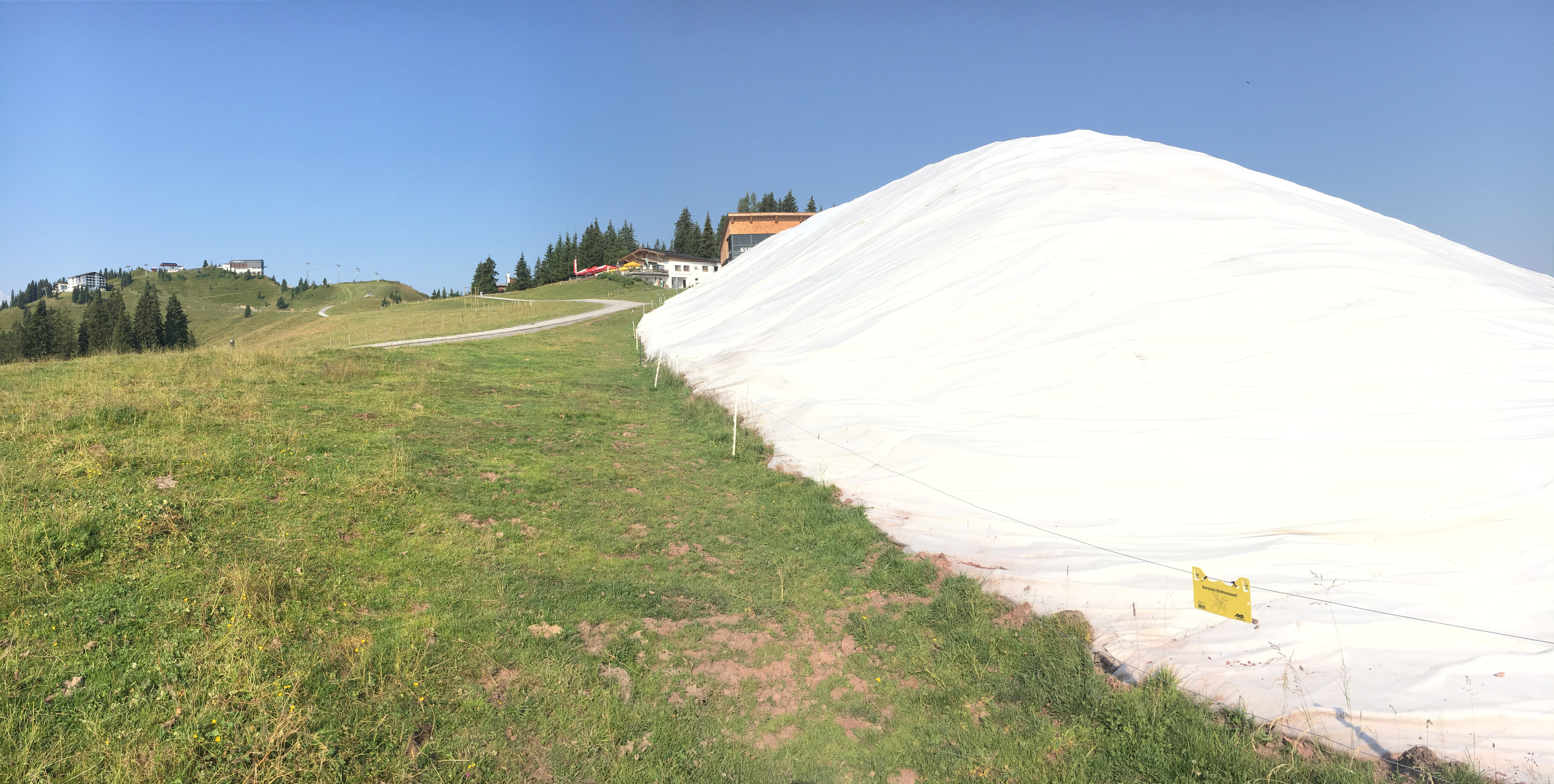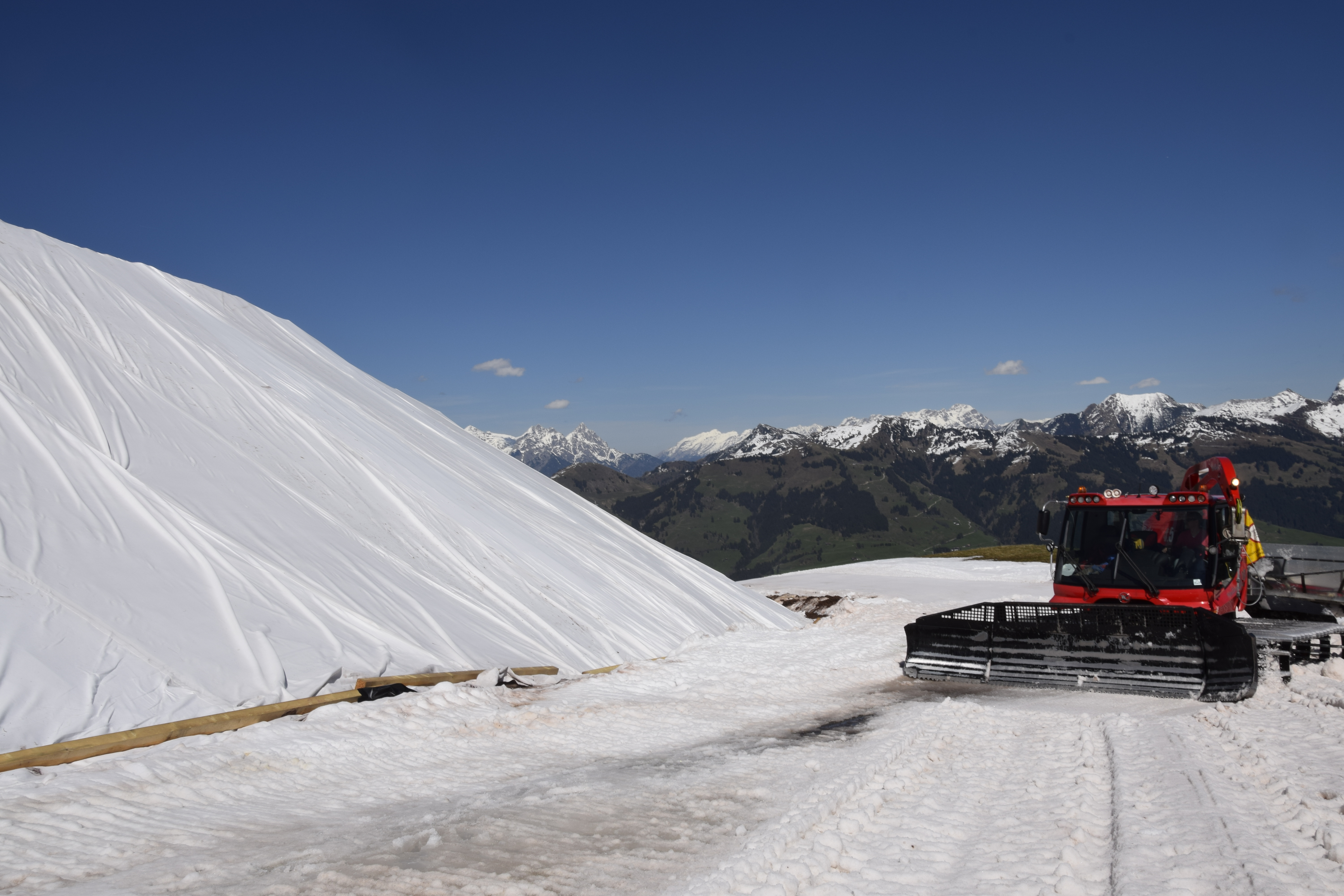 When fall is on the horizon and temperatures are getting a lot cooler, the old snow's last hour has come. The snow depot is uncovered and the snow is distributed on the slopes. The whole procedure lasts about a week; shortly after, the snow can be re-used for skiing.