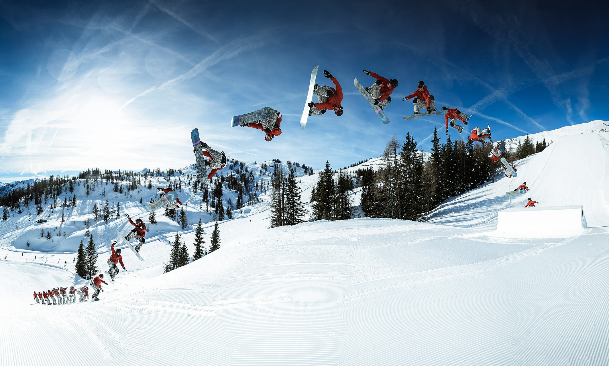 The coolest tricks and highest air time are reached at straight jumps, a type of kicker. The larger ones among them are also called big air. Often, several of them are placed in a row as a kicker line.