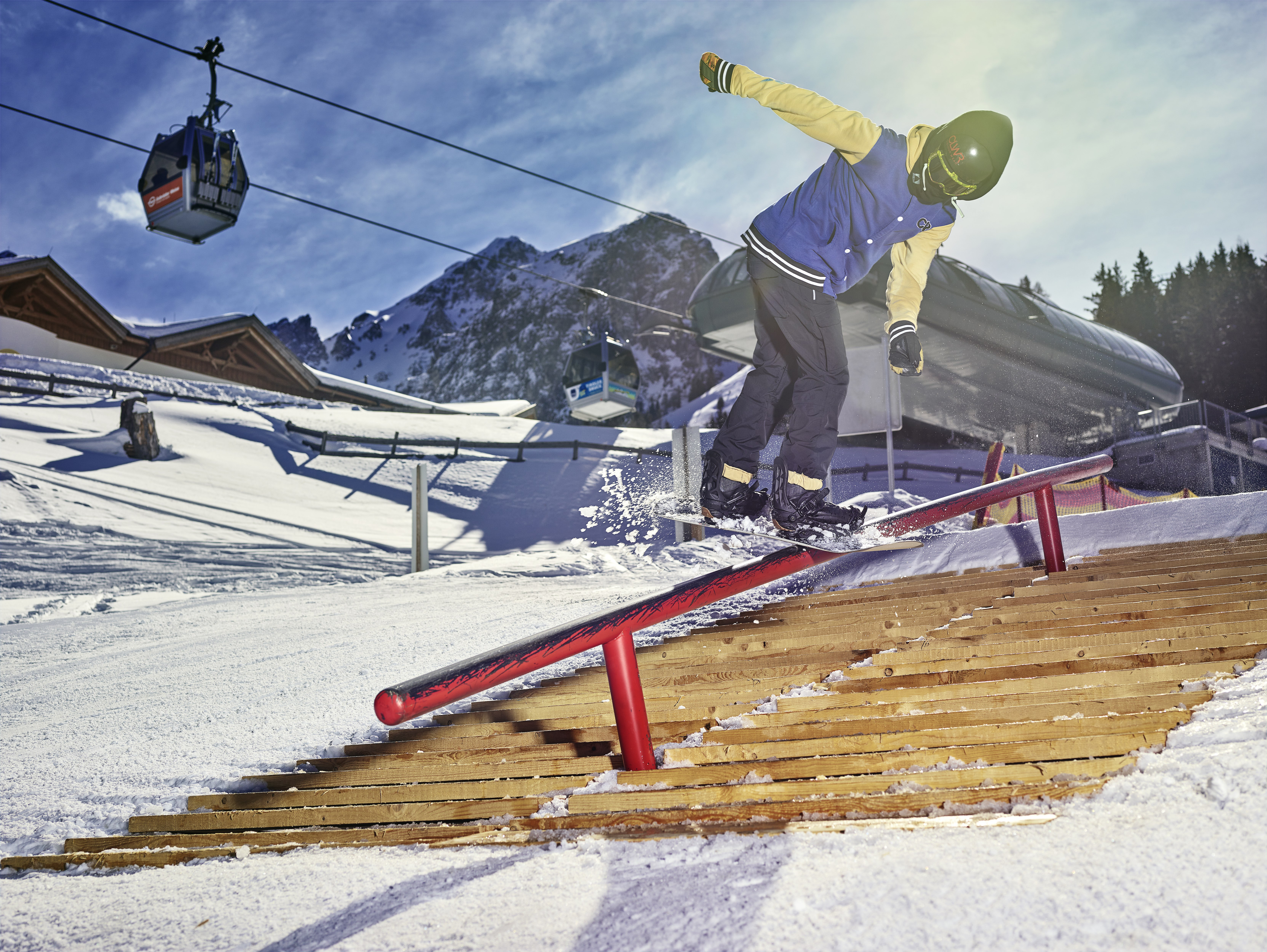Jibbing means sliding across something, which is exactly what freestylers do at jibs. Turning, jumping or performing tricks are also possible while jibbing. The difference between Jibs and Kickers is that Jibs are made of synthetic materials, steel or wood instead of snow. They often show similarities with urban elements, such as railings, tables and barrels.