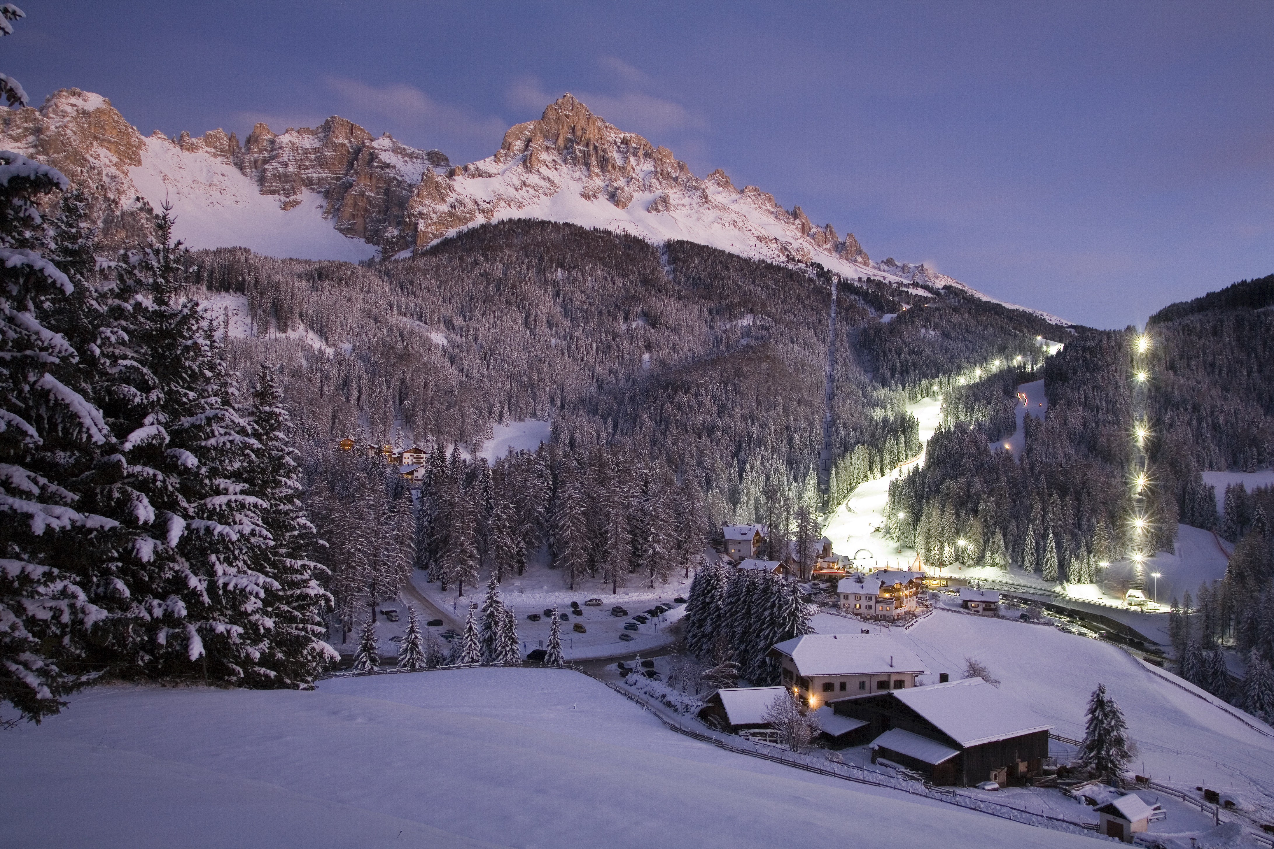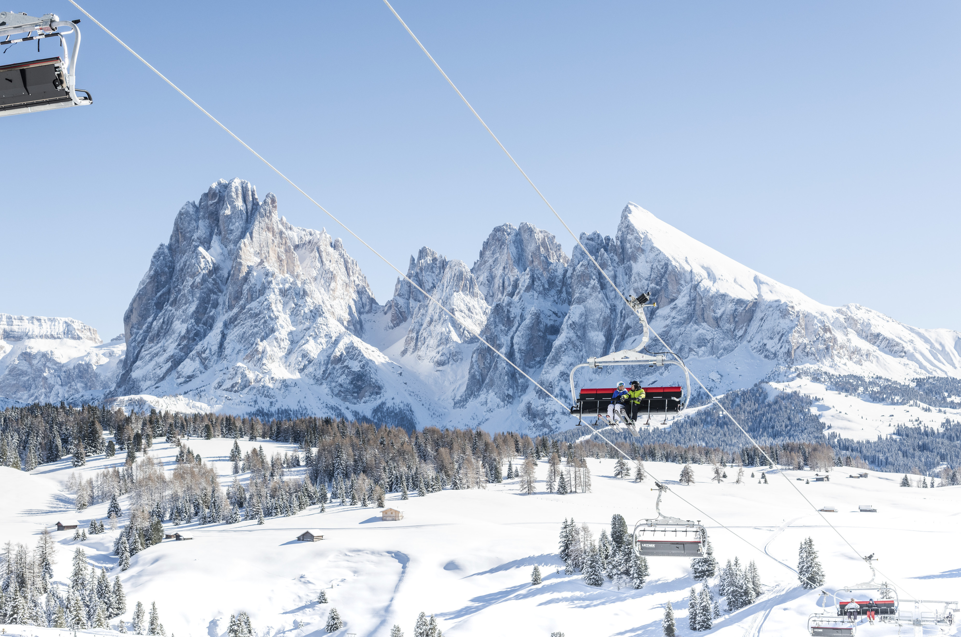 It's the biggest high alp in Europe, and THE winter sports paradise for families: Seiser Alm. The 60km/37mi of slopes above the town of Seis am Schlern are the perfect place to try your first swings on skis, or to enjoy the unique view of the imposing Schlern mountain and the Dolomites on a pleasurable carving run. The wide panoramic run is an ideal practice spot, and several of the red-marked runs are also doable for beginners relatively soon. Experts can take the connecting lift into the more challenging ski resort Val Gardena – Gröden. The terrain park underneath Seiser Alm top station is among the top terrain parks in Italy as well as worldwide. On a length of 1.5km/0.9mi, freestlye fans find around 70 obstacles on three lines of varying difficulty levels.