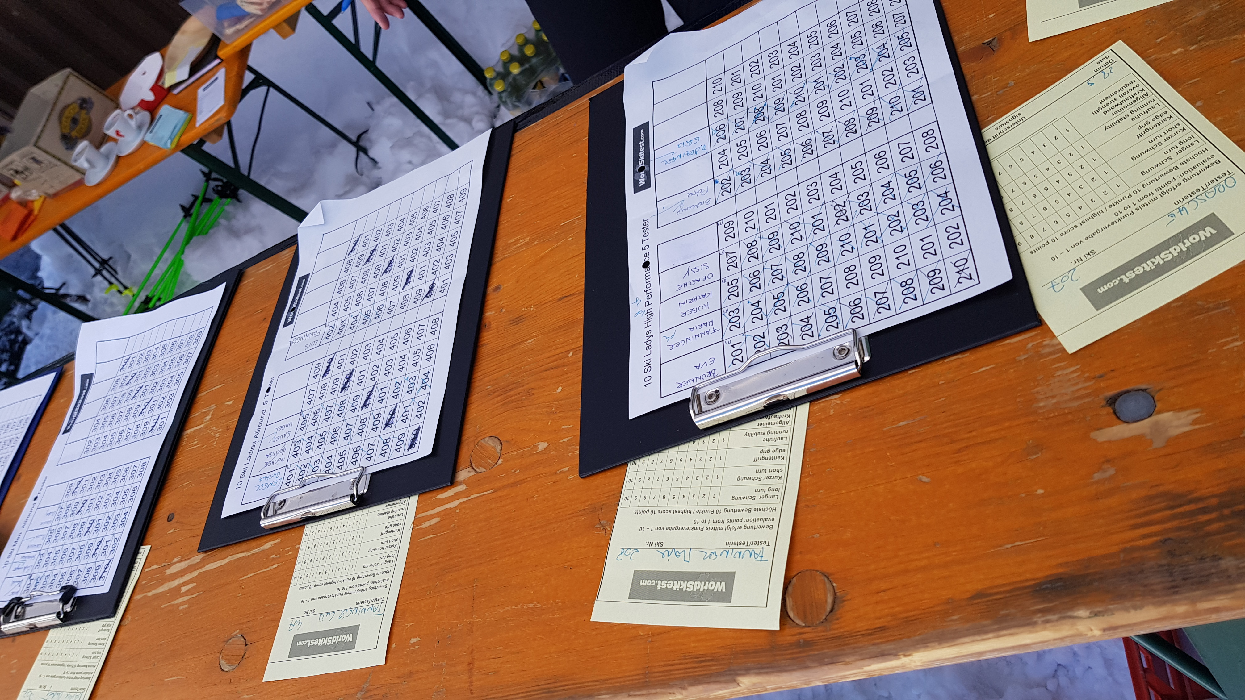 At the end of each run, the test sheet for the ski is filled out. The characteristics long turn, short turn, edge grip, running stability and overall strength requirement are evaluated. For freeride models, instead of edge grip, turning ability is evaluated, and for touring skis, handling and function of the skins. The points range from 1 to 10, with 10 being the optimum rating. Once the sheet is filled out, it is handed in at the test station and the tester is assigned the next ski. During the changeover, the technicians adjust the ski individually to the skier with sole length and DIN-setting and check before the descent whether everything really fits correctly.
