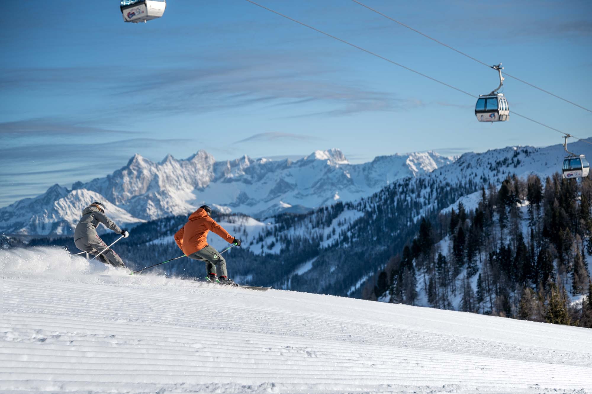 Another highlight is the connection to the 12 Peaks Trophy: a ski tour that takes you over 12 peaks and through 5 valleys, covering a total of 210 continuous kilometers of slopes. This connection is made possible by the Panorama Link lift, which links Zauchensee directly to Snow Space Salzburg, creating one of the largest interconnected ski areas in Europe.