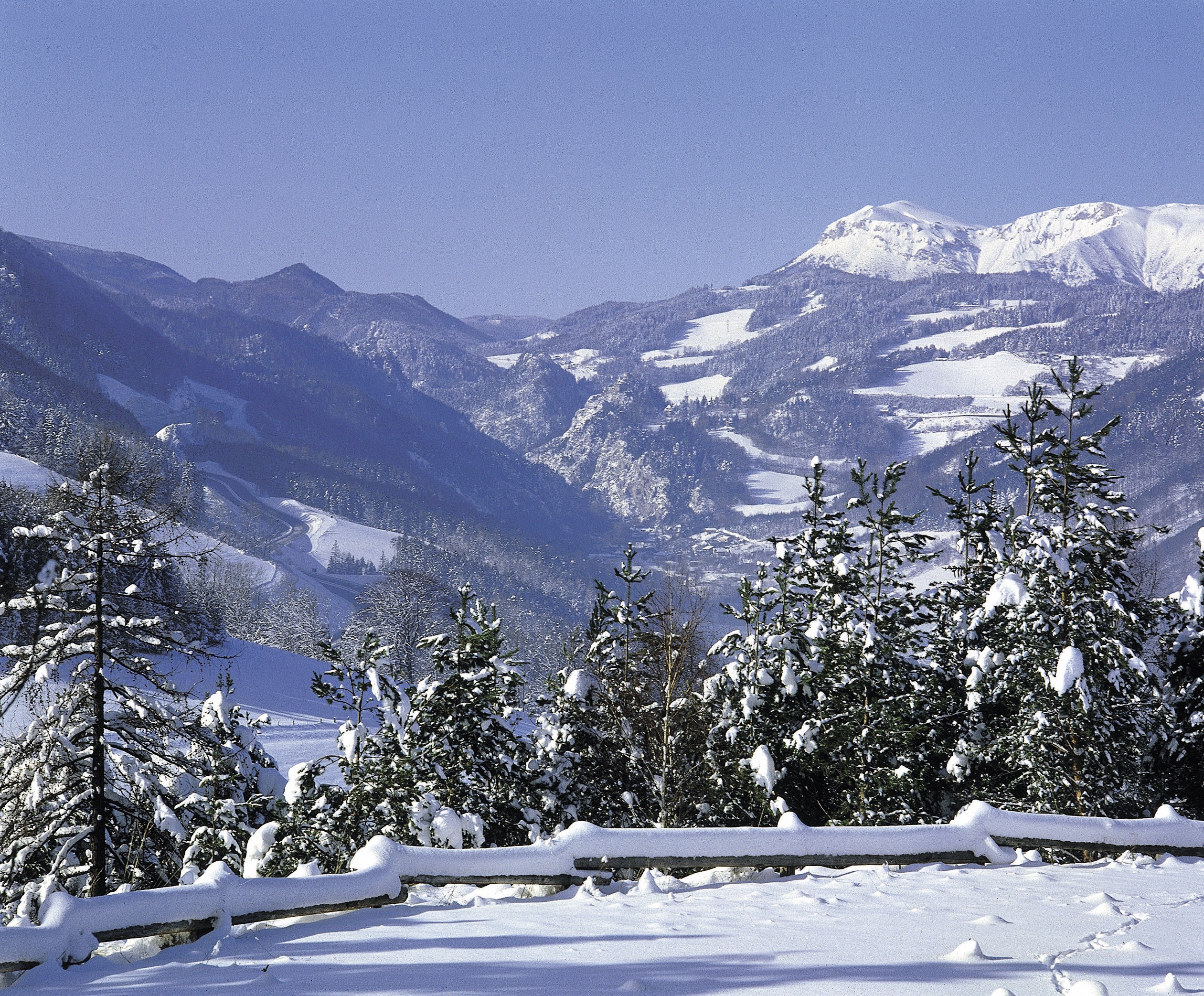 View from alp Moenichkirchner Schwaig at the ski resort Moenichkirchen in Lower Austria.