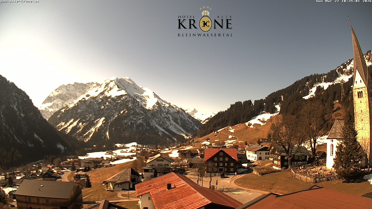The webcam is located at Alte Krone Hotel and shows parts of the mountain village Mittelberg.