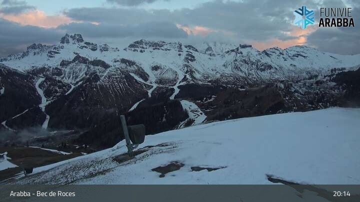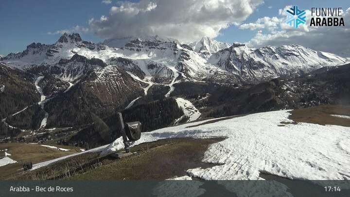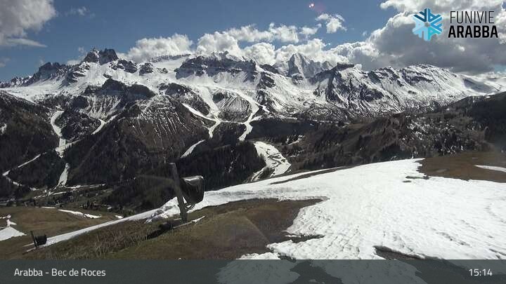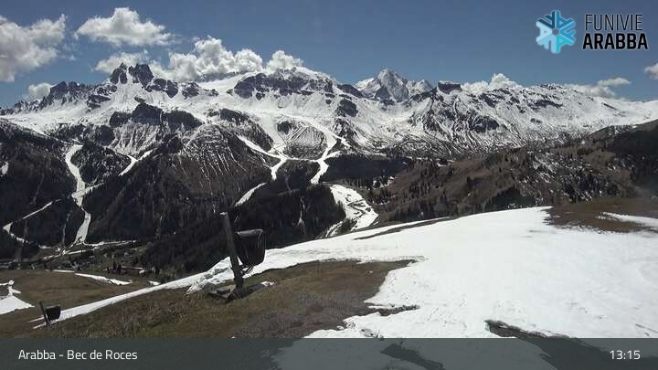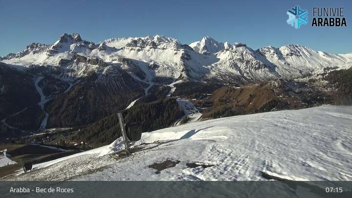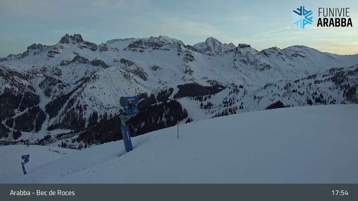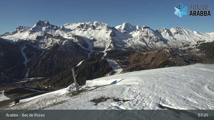 The webcam is located at the top station of the chairlift Arabba-Monte Burz in the ski resort of Arabba. You can see the mountain restaurant Rifugio Burz and the slopes at Le Pale chairlift.